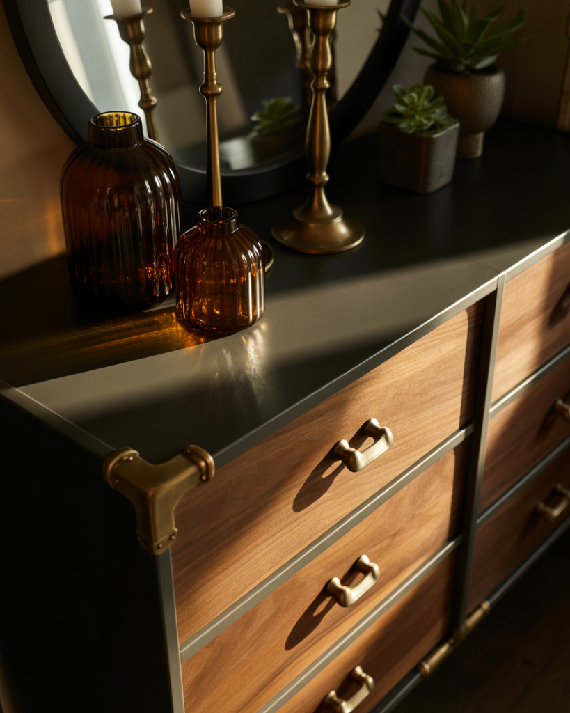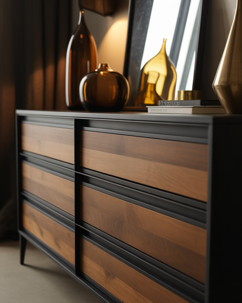 The combination of black and wood dressers offers a warm top with a cold black front and seems to be the new 2026 trend. The warm element brings balance to the cold, and it works well with mid-century-styled deliberate decor, bedroom casual aesthetics, or even industrial-styled homes. Amber glass bottles or metal trays styled on top warm the contrast instead of making it harsh.