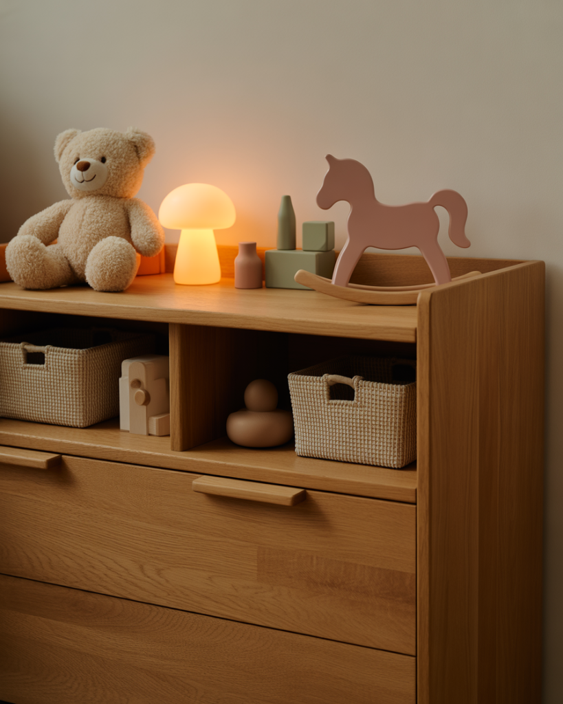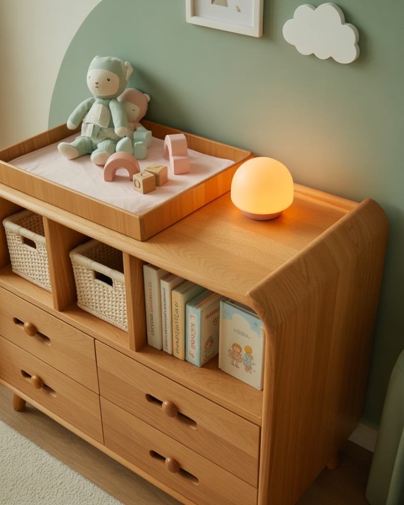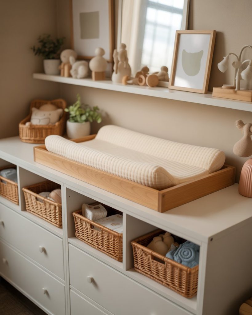 A dresser in a nursery does double duty—storage and gentle décor. Pastel toys, soft nightlights, and woven bins keep things cute and functional. Natural woods and rounded shapes feel safe and timeless. This idea suits growing families who want style without sacrificing comfort or safety.