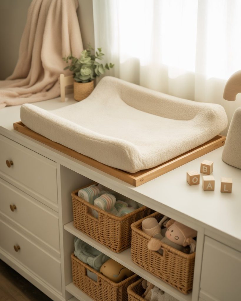 A dresser can transform into a soft-edged nursery changing table with a cushioned topper and basket storage.