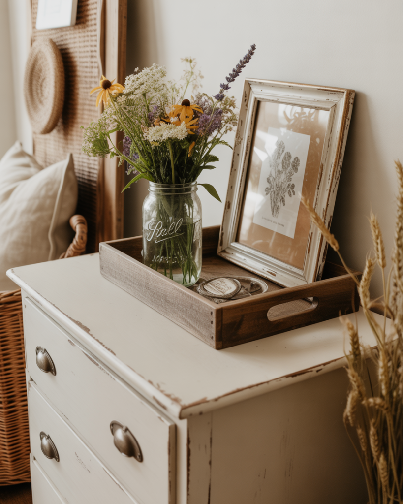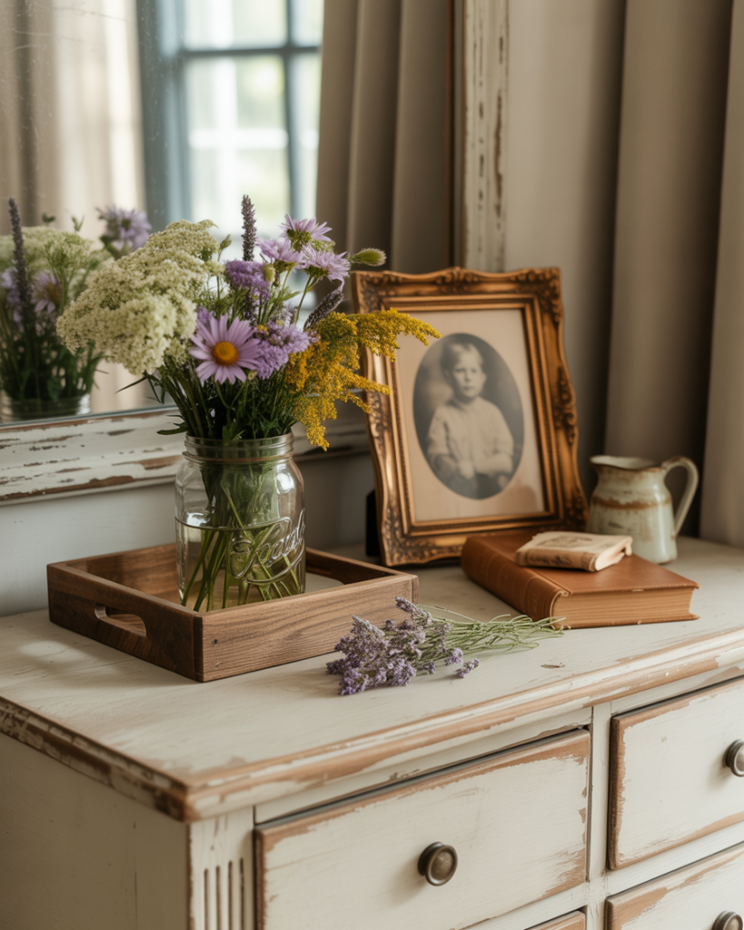 A classic farmhouse idea: add a wooden tray to corral candles, beads, and small collectibles. Pair it with a vintage frame and a ceramic jug of wildflowers for a relaxed rural vibe. Ideal for anyone who loves Joanna Gaines-style comfort without clutter.