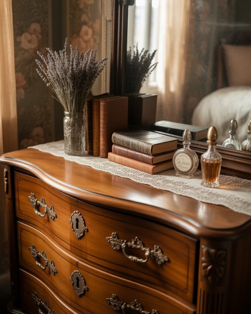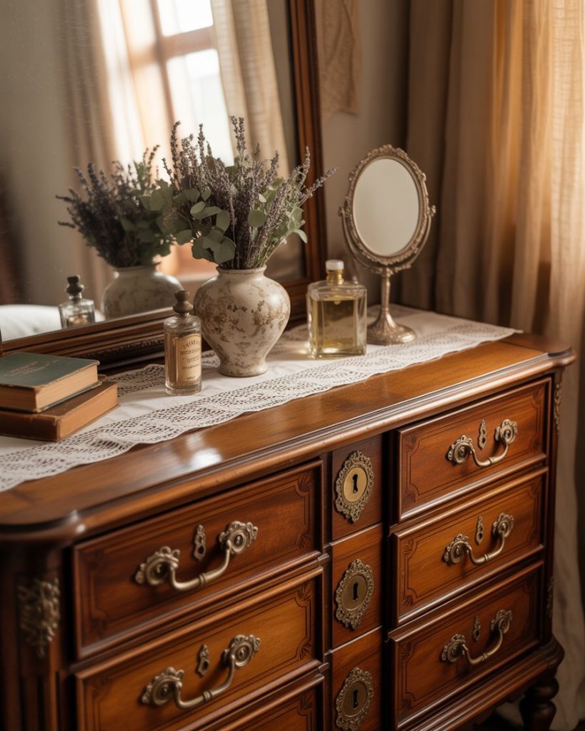 The vintage wave stays strong, especially for those who love a bedroom with story-rich pieces. An antique dresser with brass handles or a patinated mirror instantly adds charm. Pair it with lace runners, dried flowers, and framed heirloom photos. This look works beautifully in older homes or eclectic spaces where age and texture feel authentic rather than staged.