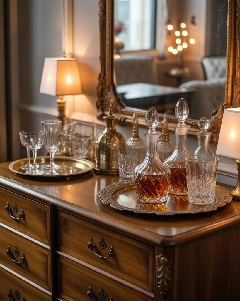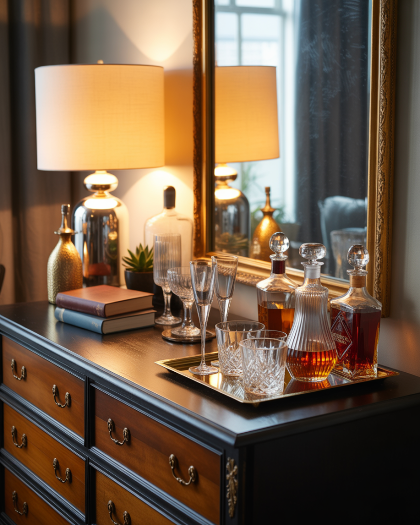 In a guest room or multipurpose space, a dresser can double as a discreet mini bar. Add a mirror above, decanters, low glassware, and a tray of favorite spirits. Works beautifully with a vintage or antique dresser to elevate the mood.