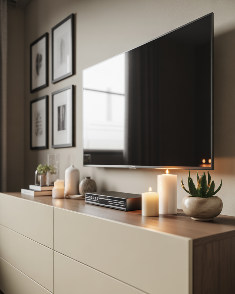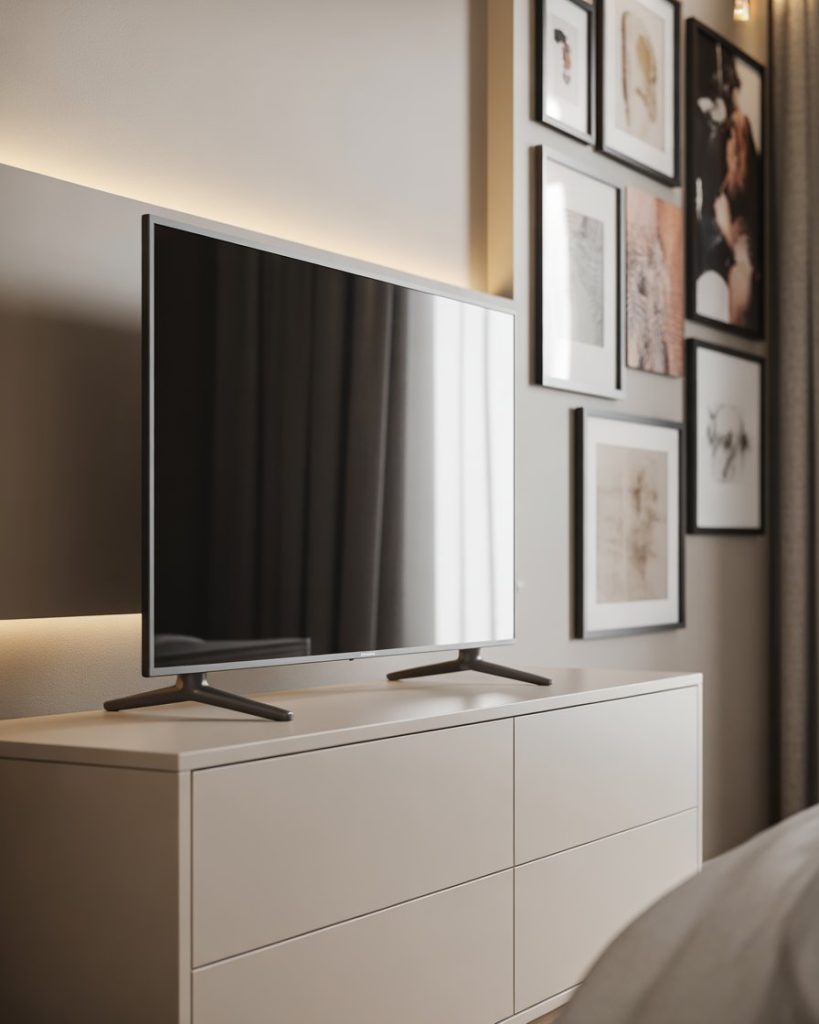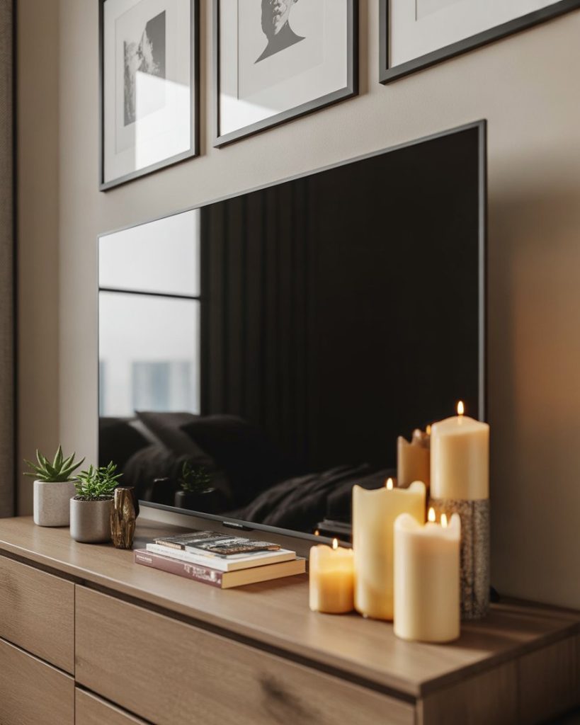 A bedroom with a TV often feels tech-heavy, so styling matters. Use low, tall decor like candles, books, and plants to balance the screen. Floating art or framed prints above the dresser help soften the tech feel. Works great in compact rooms where the dresser becomes the entertainment hub.