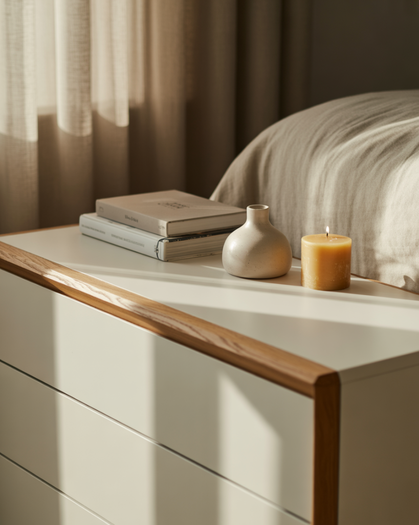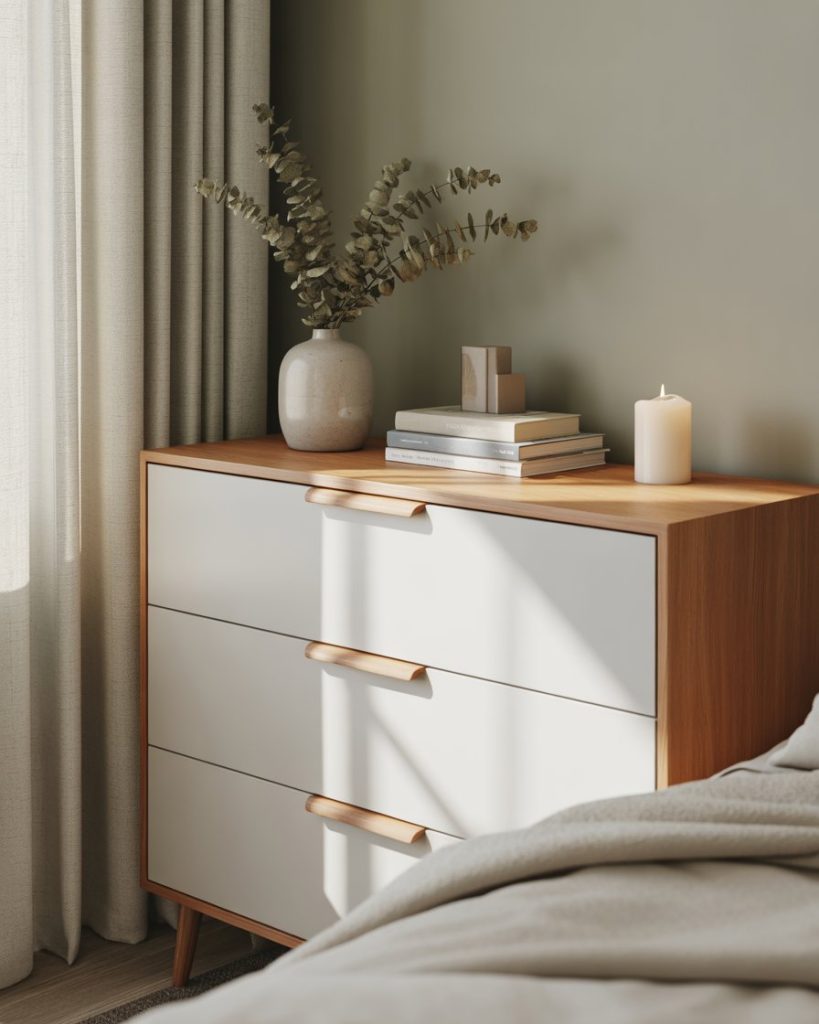 Inspired by Nordic calm, this look blends white and pale wood finishes with clean lines. It’s ideal for a modern bedroom layout where visual peace matters. A single vase, a stack of neutral books, and a soft candle are enough. Scandinavian styling focuses on what you remove, not what you add, making it perfect for calming visual noise in busy lives.