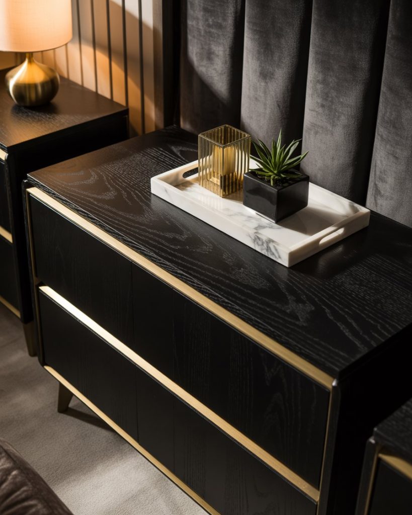 Bold black dressers are trending as dramatic centerpieces in modern bedroom spaces. Gold accents or marble trays add luxury without feeling stiff. This look thrives when paired with soft fabrics and warm lighting so the contrast feels intentional, not harsh. Perfect for city apartments or rooms needing an instant visual upgrade.
