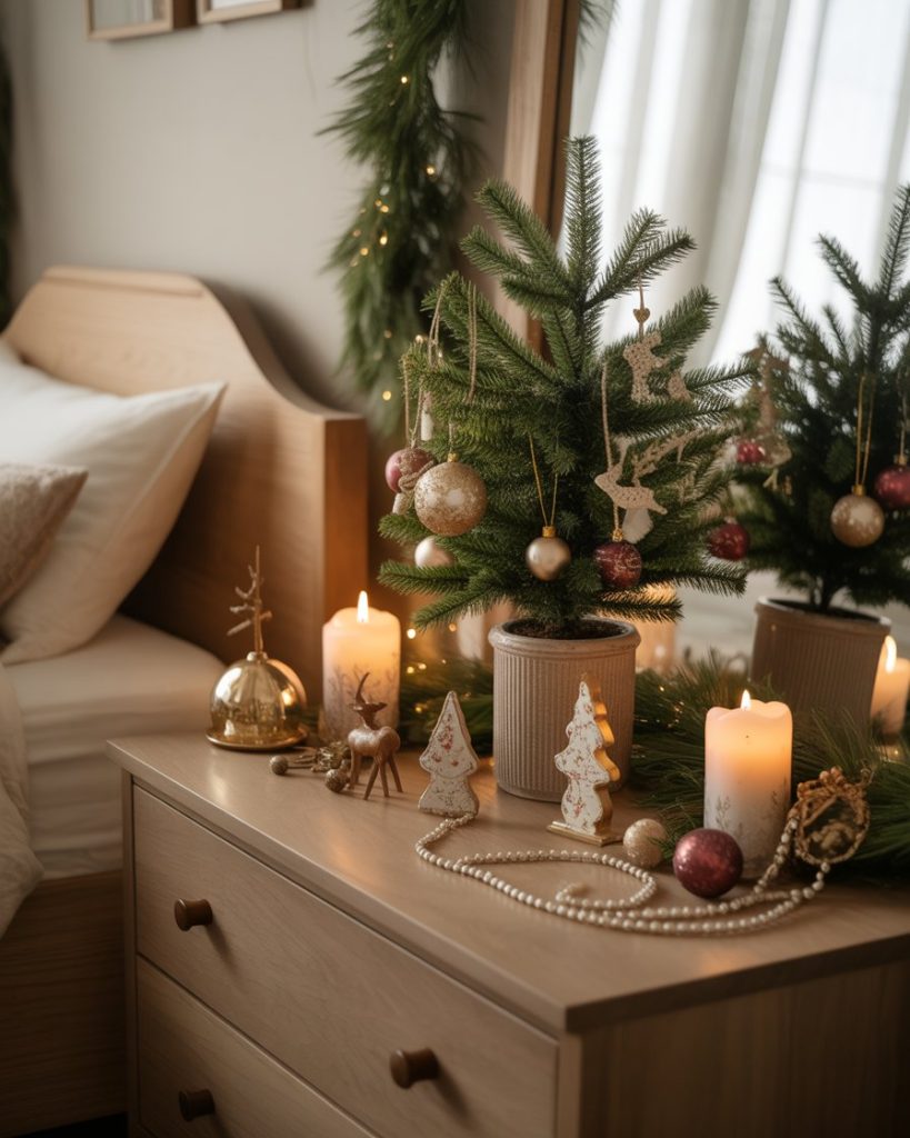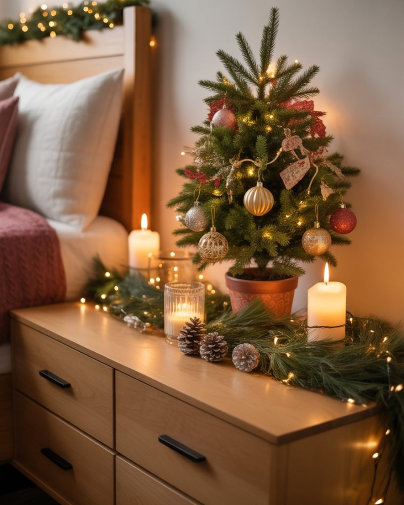 Seasonal décor is bigger than ever, and a dresser makes the perfect Christmas display zone. Mini trees, garlands, winter candles, or nostalgic ornaments turn the room festive without a full remodel. Works especially well for renters who want holiday magic without moving furniture.