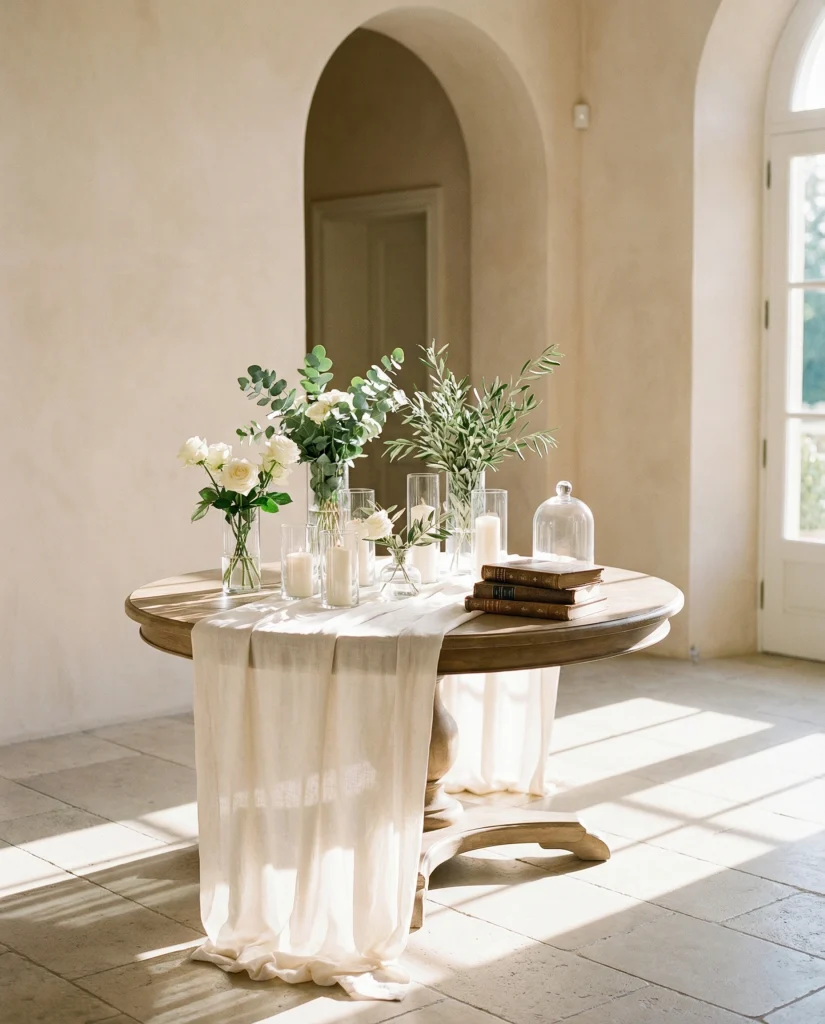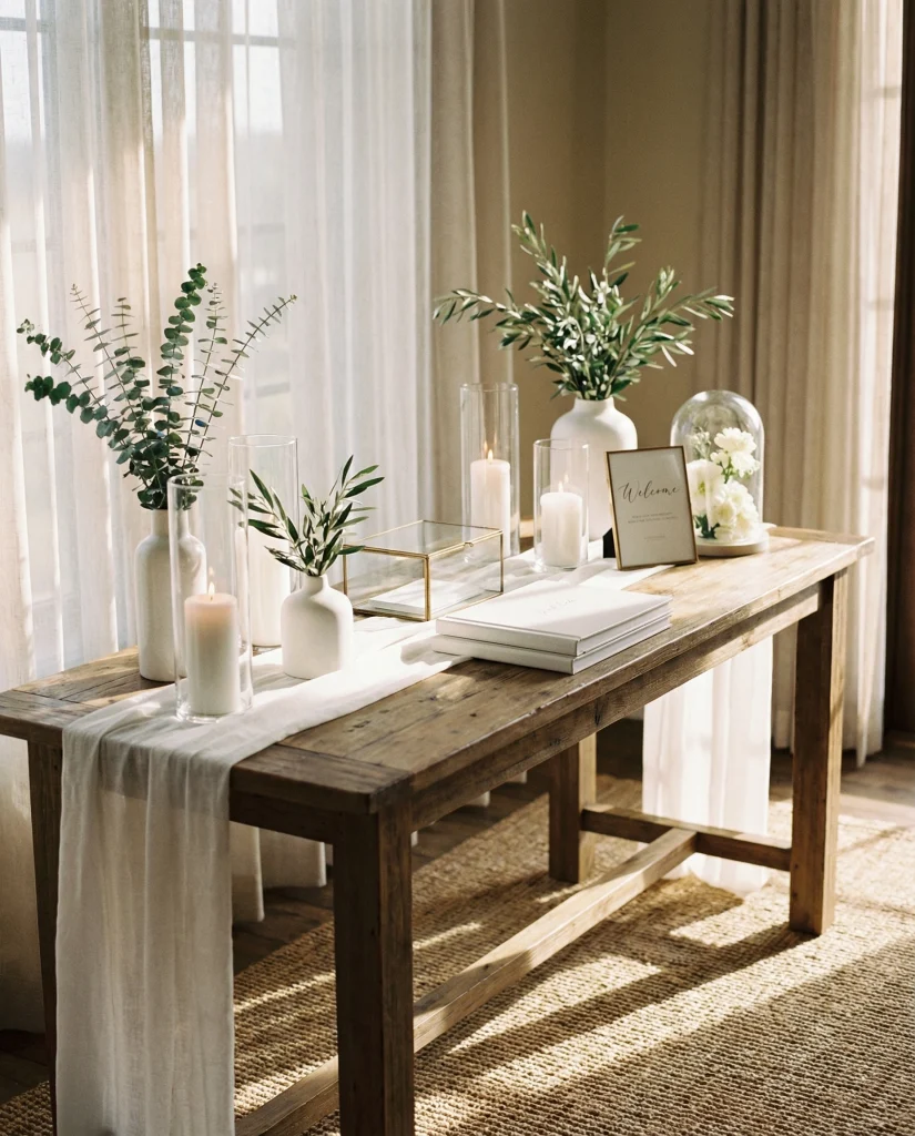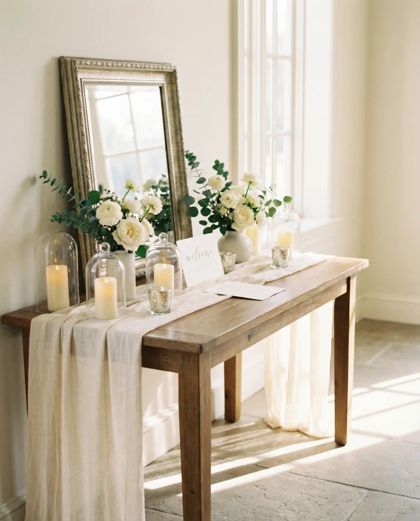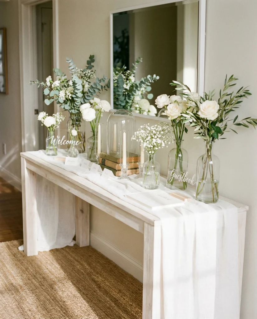 No design is more complete for the entry table in times of wedding elegance. Yet nothing says “wedding” completely like white, glass, and soft greenery. In all these instances, the home becomes a haven of rest amidst all these accusations. There, this fashion in neutral echoes highly in the parlance of stylists as enabling the establishment of natural order and serenity. Maintenance of the antique minimalist look unfolds an entire world for French-country, cottage, or farm in a fragmented entry ensemble.