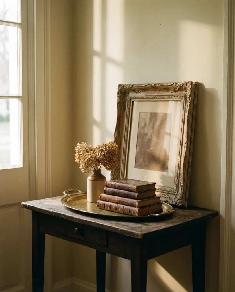 Antique items carefully placed in strategic pockets randomly over an entry table bring instant personal charmed memories. The heavy bronze trays, yellowed classic books, and large modernized mirror can integrate easily with classical styles. Inspirations can be drawn from the wonderful spreads from Architectural Digest. This idea is perfect for those who want their space to tell stories.