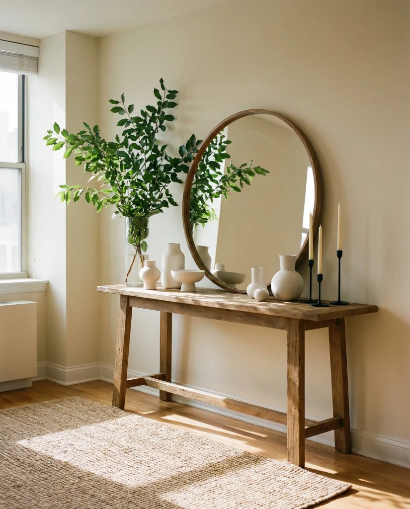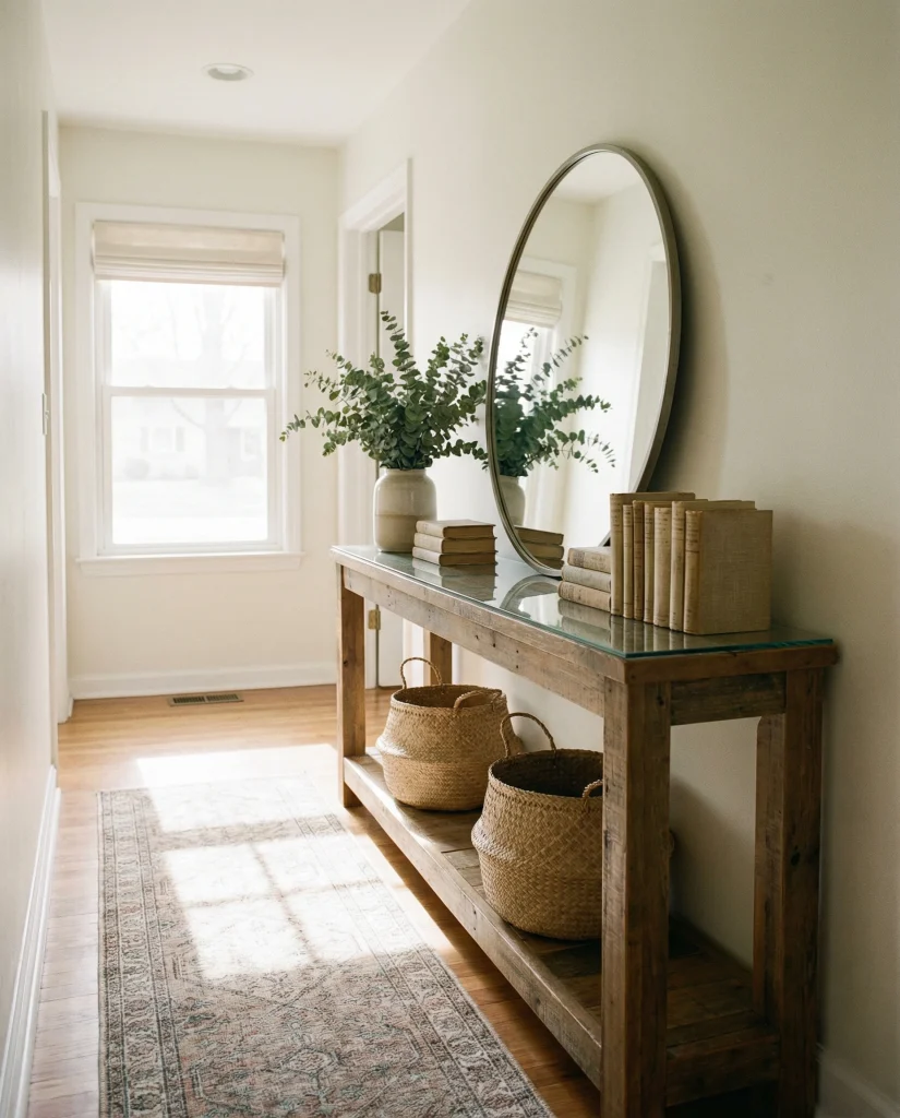Layered adorableness should carry for that rectangular table: stacked books, grand mirrors, and woven or basketry greens. Homeowners have talked about their empty hallway now being curated with this setup. Multiplying Glass with modern woody tones and textures brings harmony and light. This approach is the most ideal in suburban homes in which one extended wall is leveled into a stylish podium.