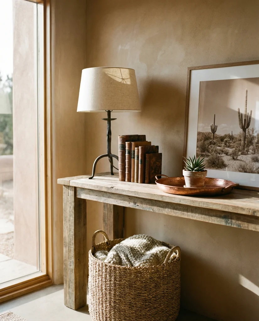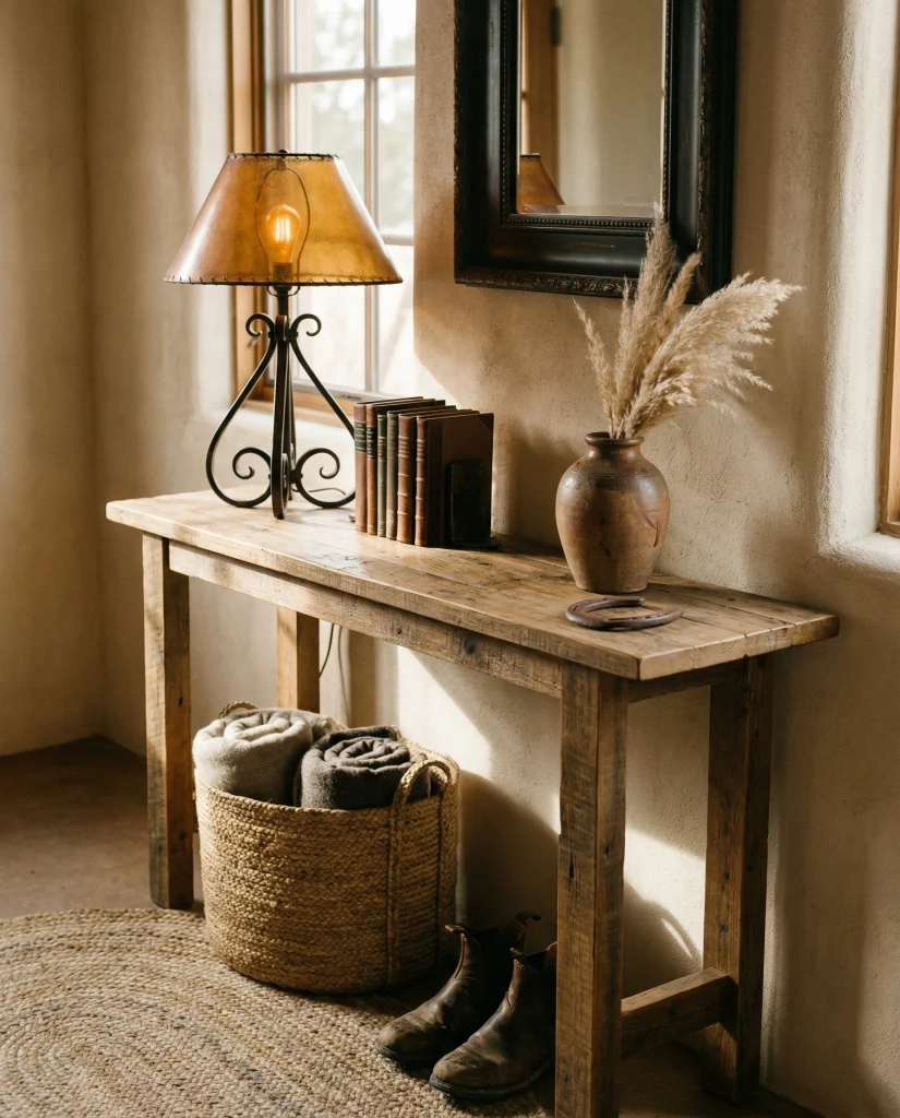 Western-inspired entry tables had a mix of ruggedness and modern quirkiness. The charm of unrefined textures, shades of earth, and hints of well-placed antique bearers for the inspiration toward Studio McGee’s modern-rustic terrain. A slight ductile…a slight ductile juxtaposition when together with a few black metal notes or some woven runner feeling grounded with sophisticated warmth.