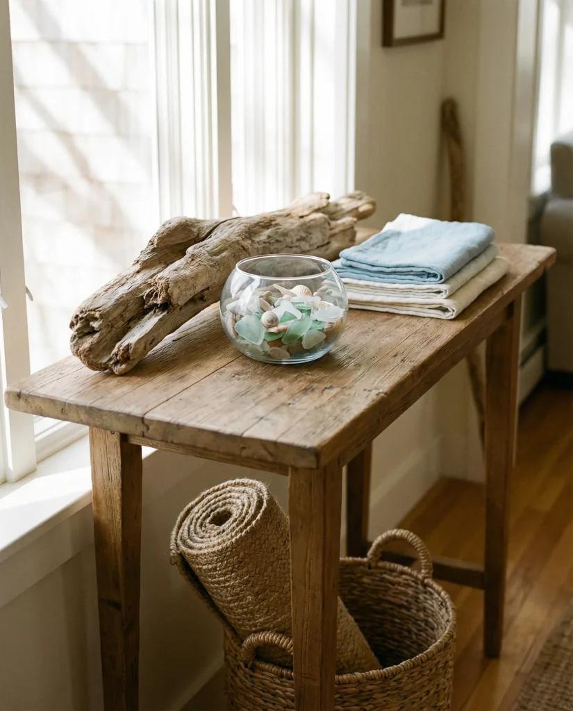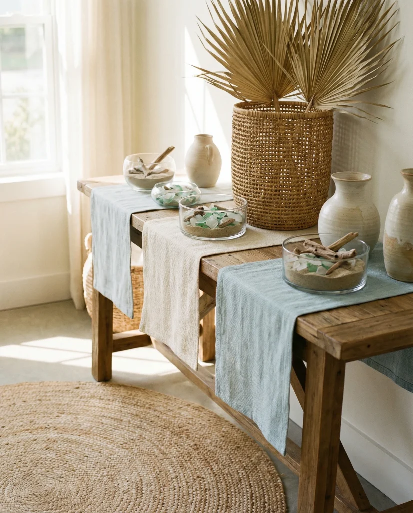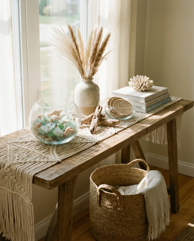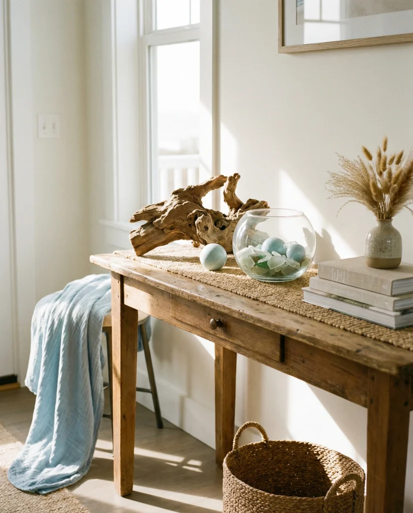 Think airy entry of summer with some delightful cool breeze-colored textures. Light greens interwoven amongst coastal and boho elements produce a splash of whimsy. Make use of glass bowls brimming over with shells or green to get that feeling of freshness without crowding the surface of the table. Many similar nature-loving homeowners believe that simply changing the decor for summer gives their homes a more open feeling during summery months. It seems to slightly pass for those with coastal, transitional, or casual modern homes.