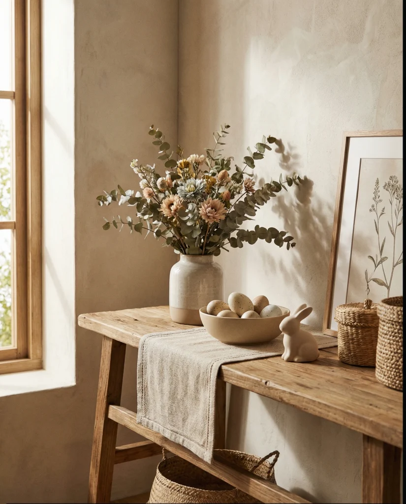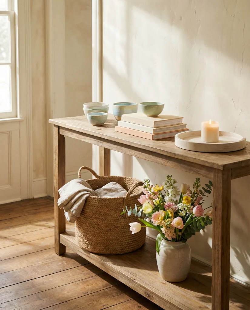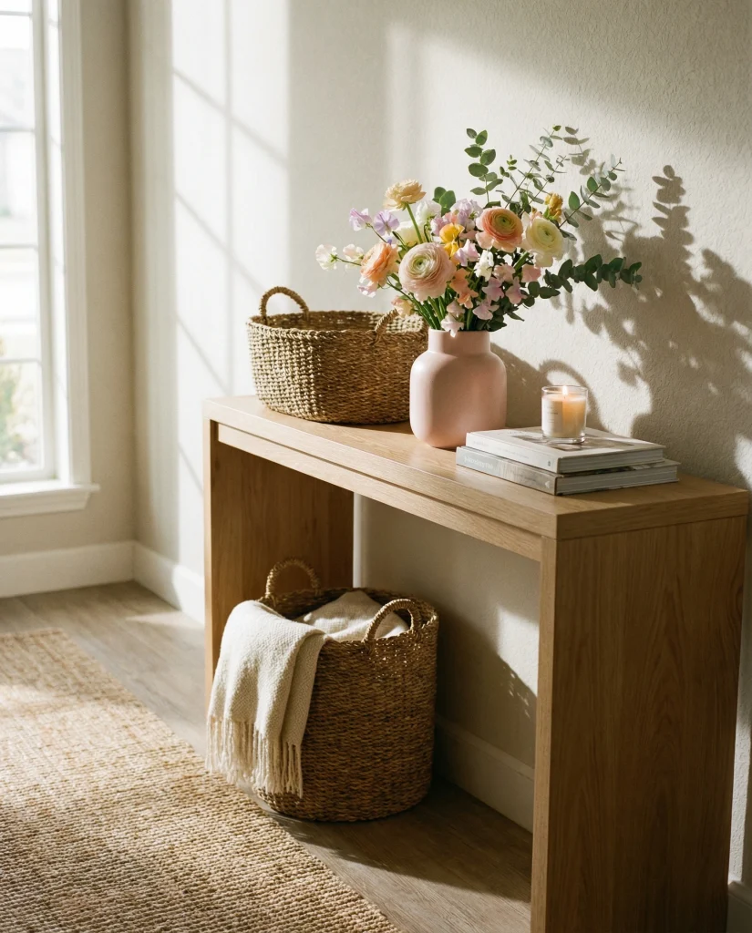 A trip to the well of life for spring entry updates in any foyer. Fresh floral blossoms, light woods, and baskets woven with wide soles or pastel colors seem to step in there naturally. Just a simple ceramic vase uplifted my own dark little entry a month last year. This idea is designed for people who like the enjoyment of quick seasonal refreshes, with minor decorating efforts necessarily induced along the way.