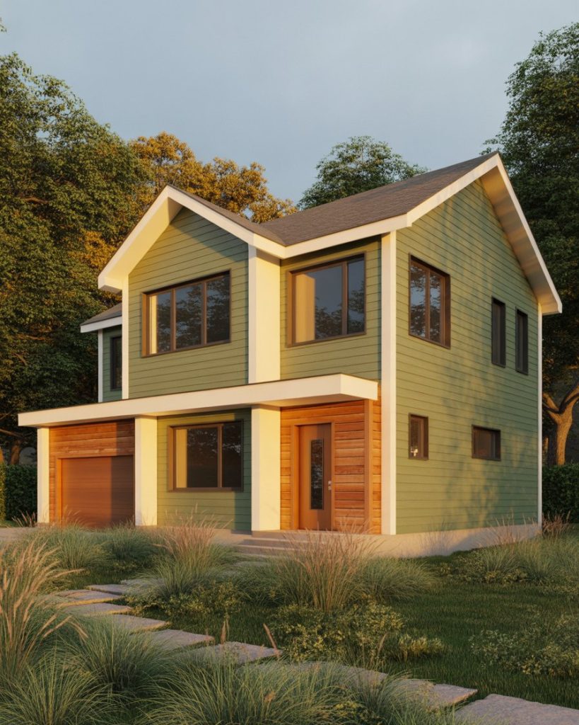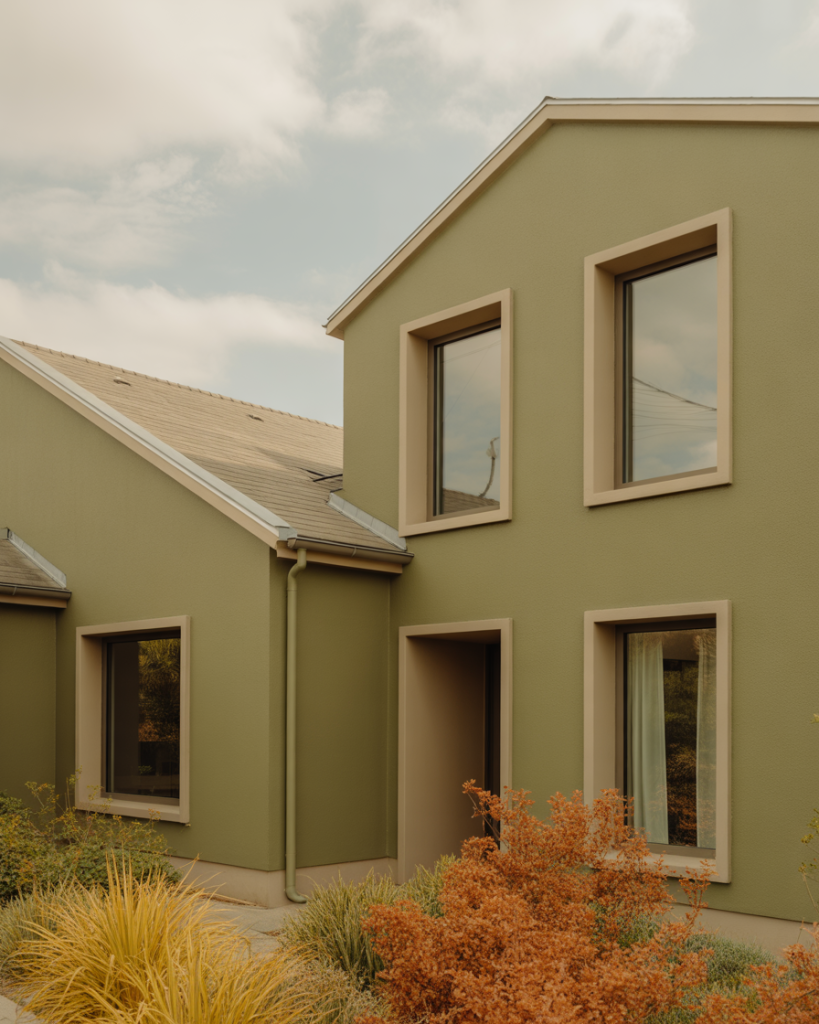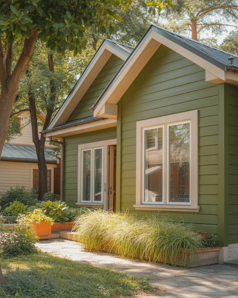 Soft olive green paired with warm beige trim provides a gentle contrast that works beautifully on contemporary and transitional homes. I’ve seen it give bungalows a fresh, nature-inspired look that fits 2026 color preferences. It strikes a balance between calm color and approachable warmth.