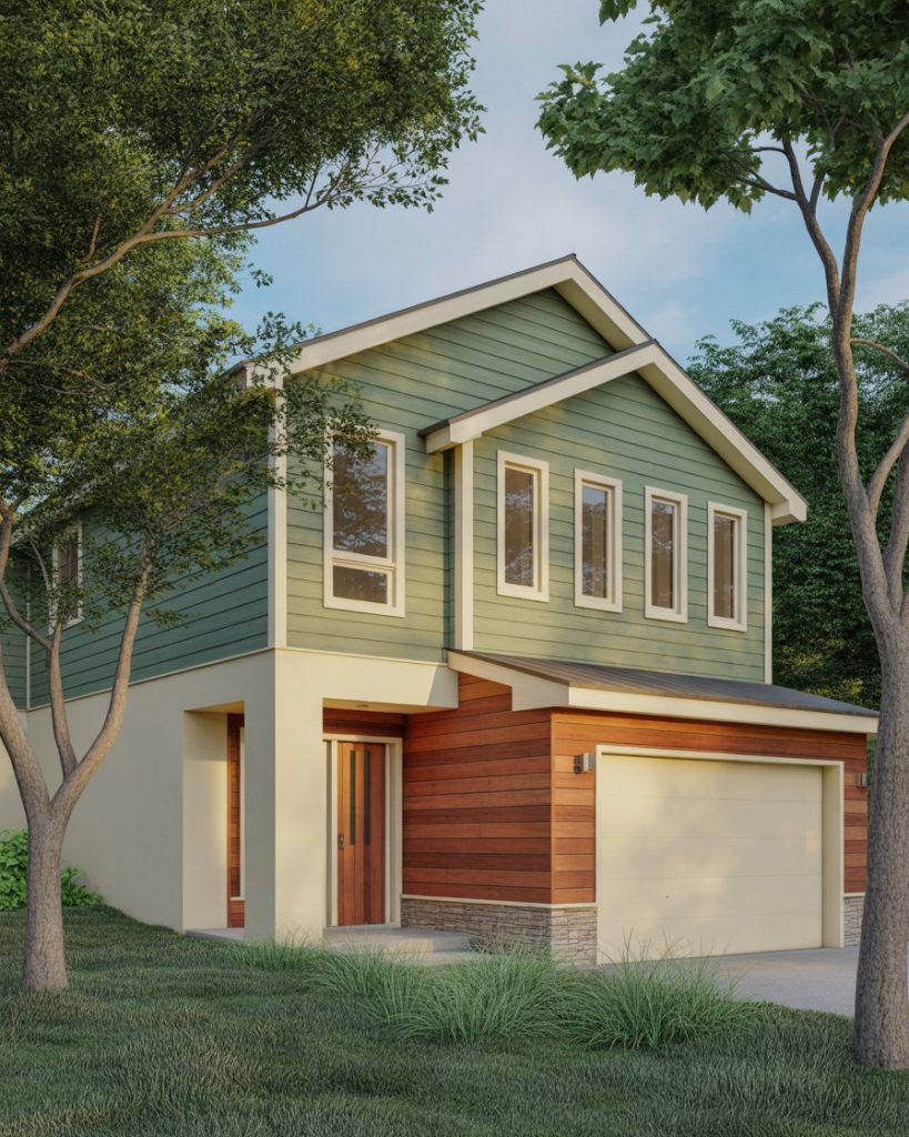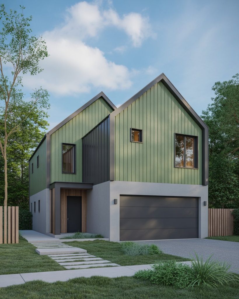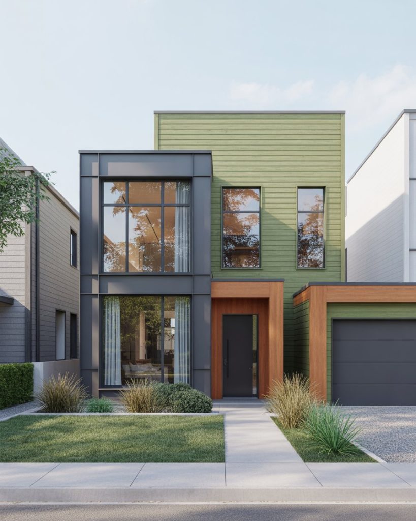 A mix of green, soft gray, and natural accents supports the sleek modern direction many homeowners take in 2026. I’ve seen this combo work beautifully on townhomes where green brings vibrancy while gray keeps the architecture grounded. It’s sophisticated without feeling too traditional or too bold.