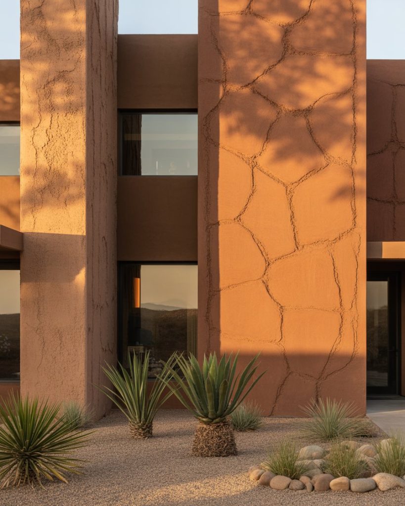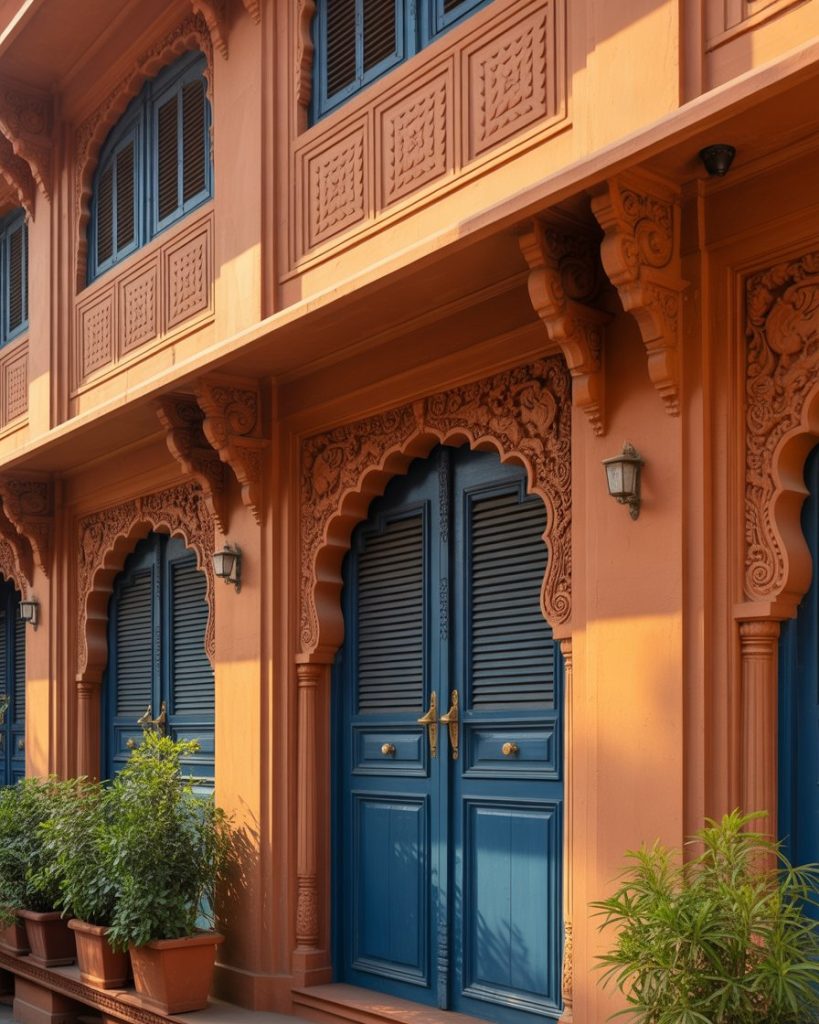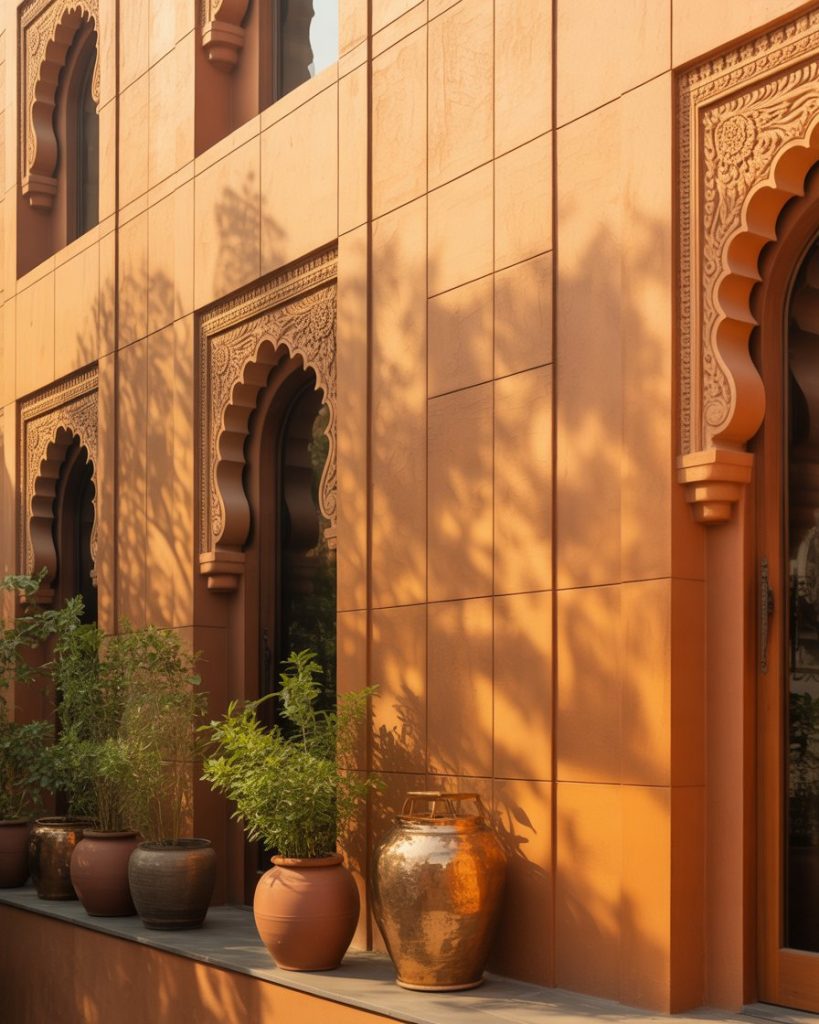 Homes inspired by Indian style use terracotta, clay, and warm neutrals to create radiant curb appeal. A colleague who visited Rajasthan said these hues feel like “sunset on a wall,” and the effect is unforgettable. Paired with dark, earth-tone, or cream accents, this palette adds global personality and warmth.