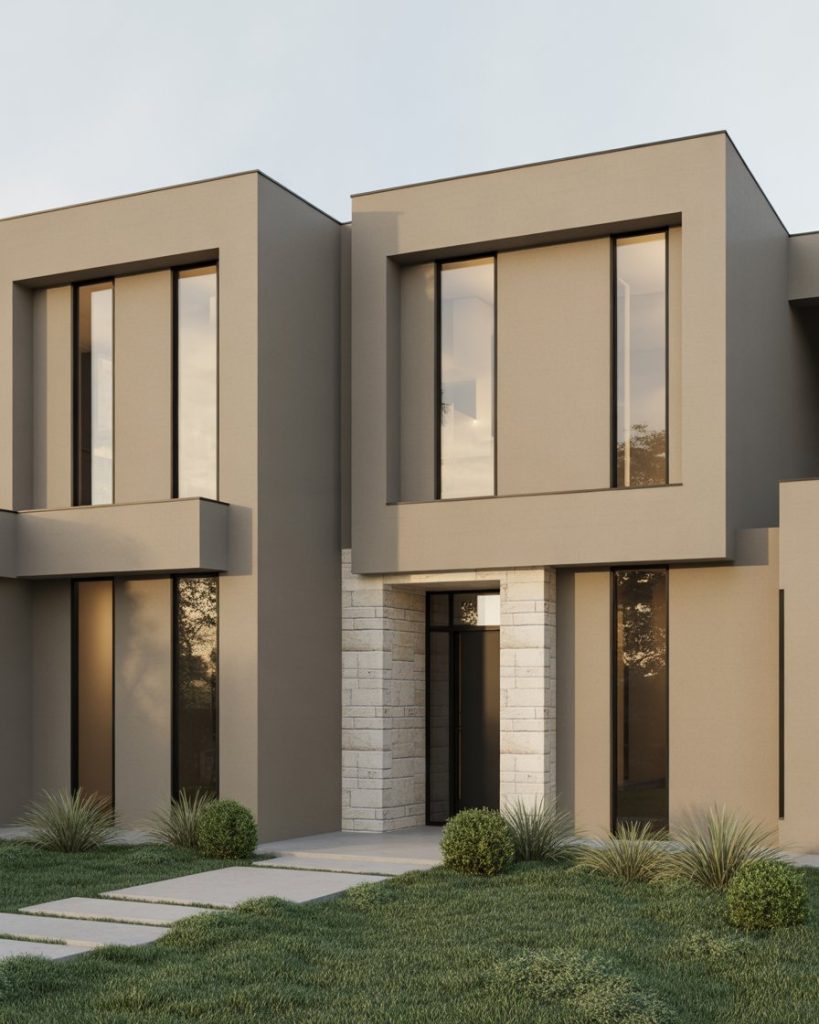 The mix of greige, soft gray, and bold black trim continues to rise in 2026 trends as homeowners seek a clean but warm exterior. I’ve seen this palette on modern suburban builds where the greige softens the structure, while black details add crisp definition. It works beautifully for both small homes and wide-front ranch styles.