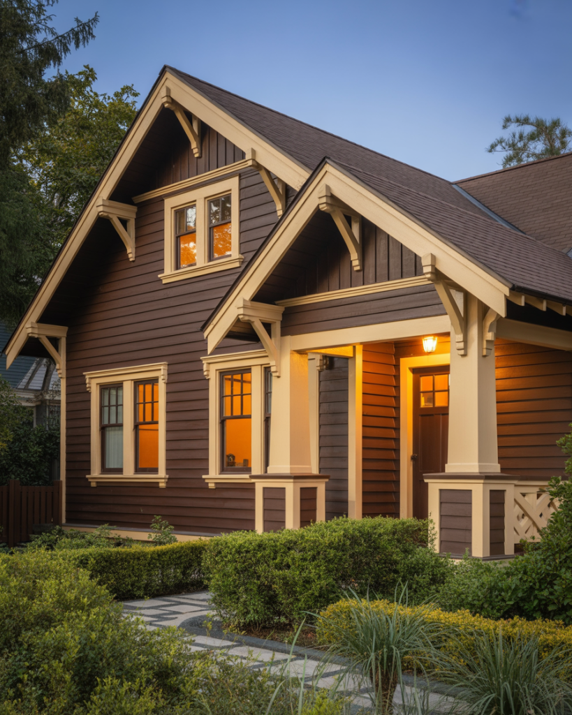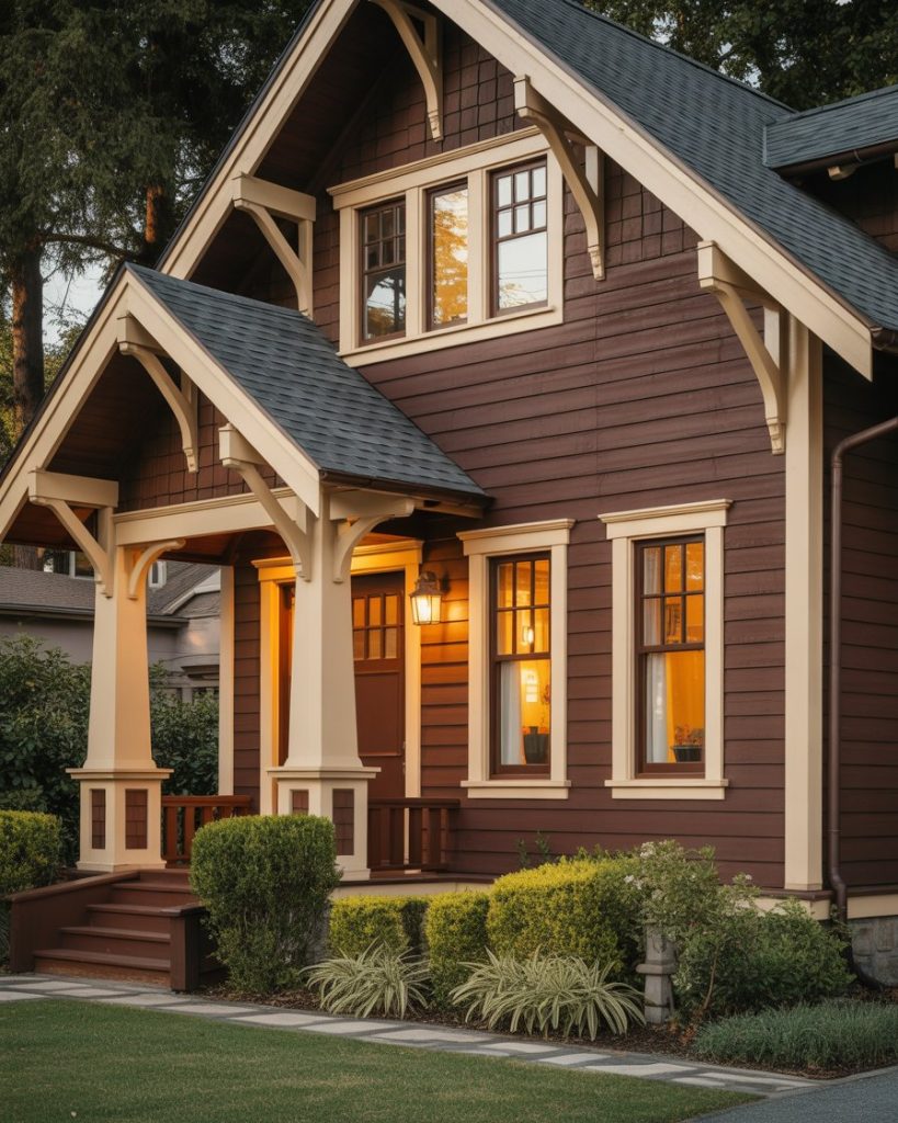 Using rich dark brown siding and soft cream trim creates a warm and classic look that feels timeless for 2026. A family in my area chose this palette to make their craftsman-style home feel more grounded, and the result was stunning. Cream softens the dark base and brings elegant balance.