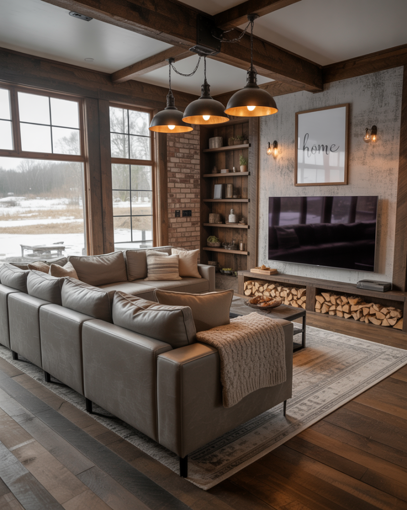 The modern rustic farmhouse living room is all about harmony between sleek and rugged. Picture a gray couch paired with rough-hewn beams or an industrial lamp next to an antique table. It’s where comfort meets practicality, blending old textures with new conveniences. One friend told me she loves how her tv wall fits seamlessly into her reclaimed-wood space, creating a home that feels both current and timeless.