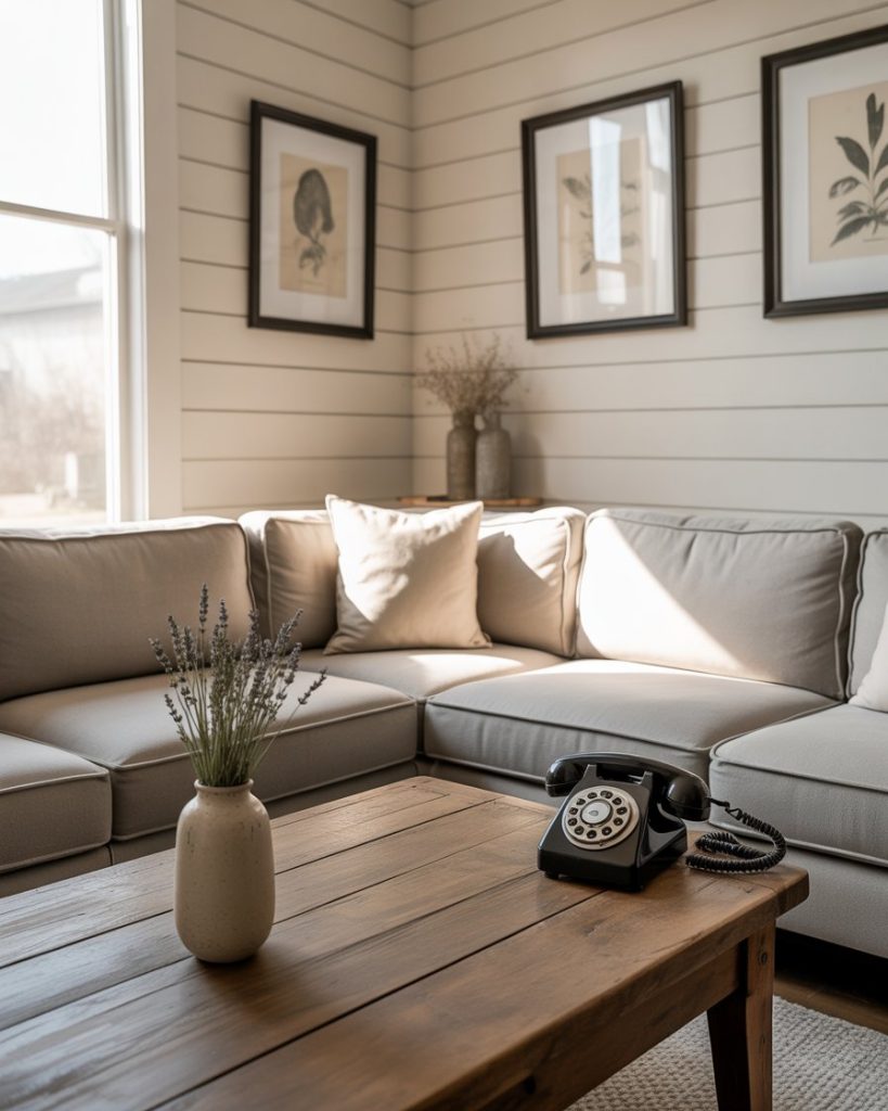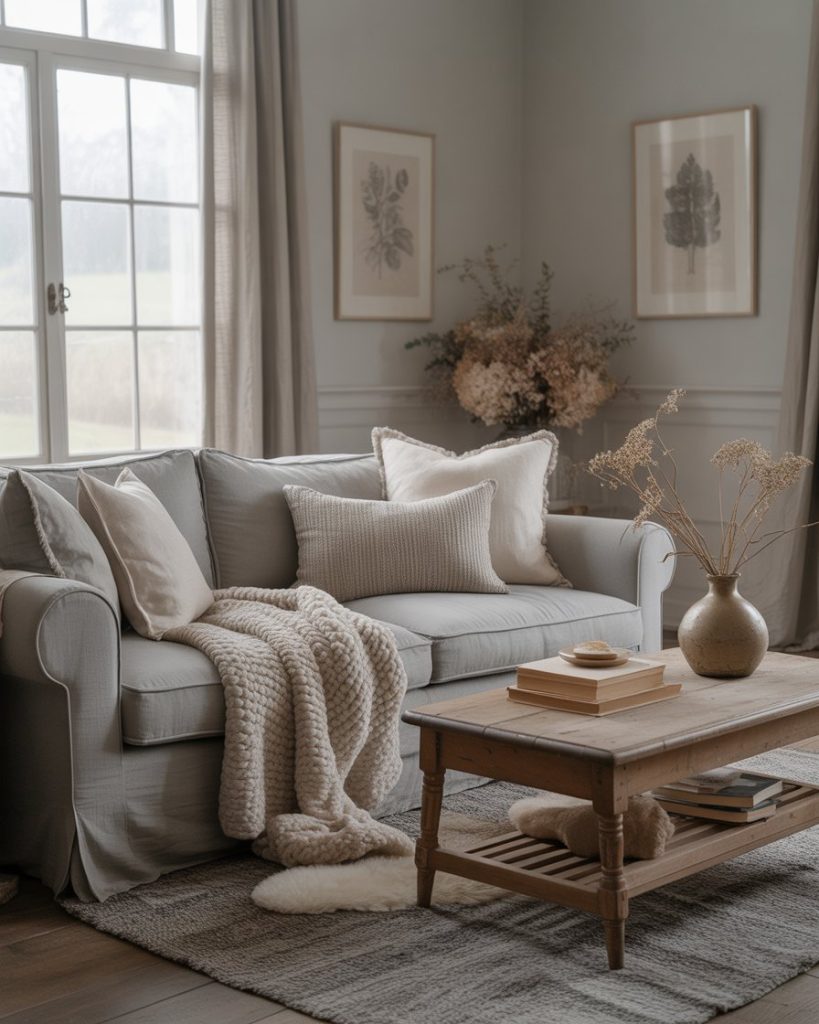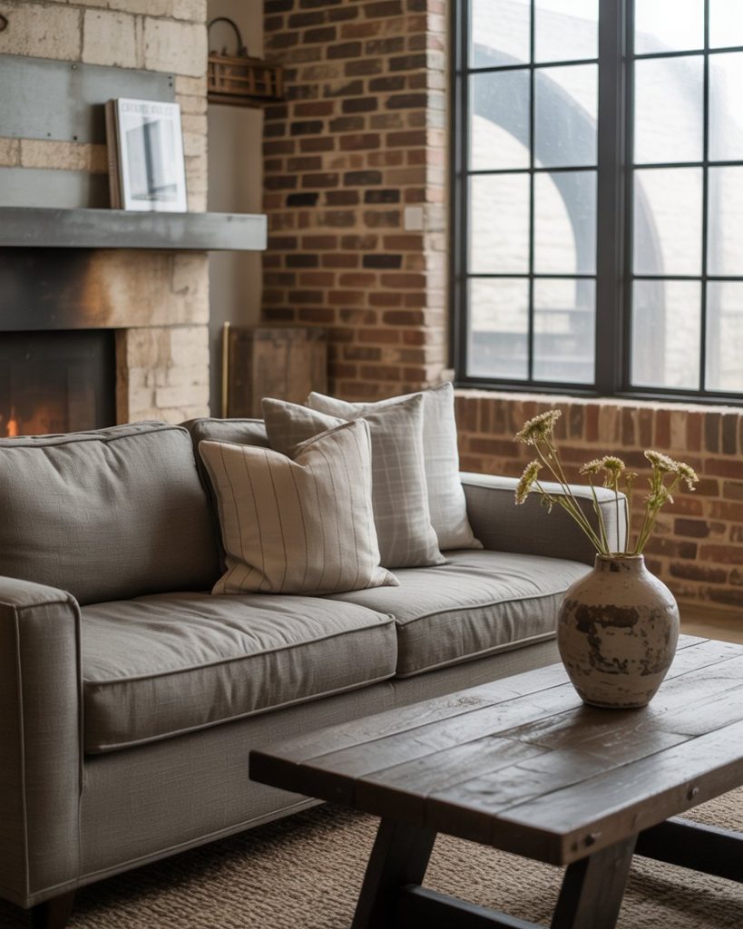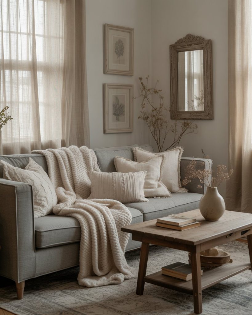A grey farmhouse palette creates calm sophistication. Pairing a grey couch with soft throws, layered neutrals, and muted wall decor can turn even busy homes into serene retreats. It’s a safe yet stylish choice, perfect for those who don’t want bold color. I once saw a space like this, and it felt so balanced that you wanted to linger all day with a cup of tea.