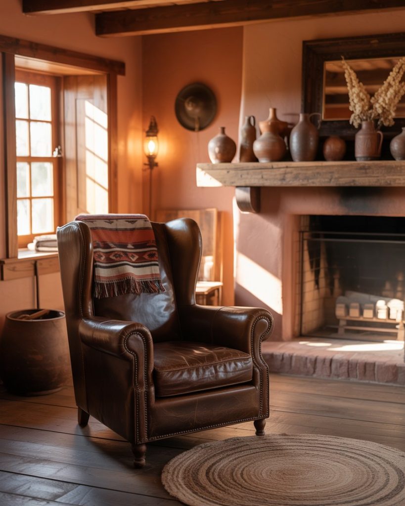 The Western rustic farmhouse channels ranch-house character with rugged rustic furniture, leather seating, and Native-inspired textiles. Bold paint colors like ochre and terracotta add warmth. A family once told me their Western farmhouse room was where everyone gathered because it felt sturdy and real—a true heart of the home. It’s bold, cozy, and unmistakably farmhouse.
