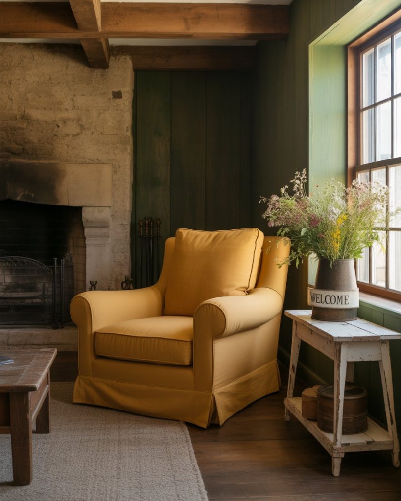 While many farmhouse living rooms stick to neutrals, bold paint colors like mustard, navy, or even hunter green can make the room stand out. When paired with farmhouse staples like wood beams or antique pieces, they add depth. I once painted an accent wall in my own living room a rich green, and it immediately shifted the atmosphere—suddenly it felt cozier and more personal.