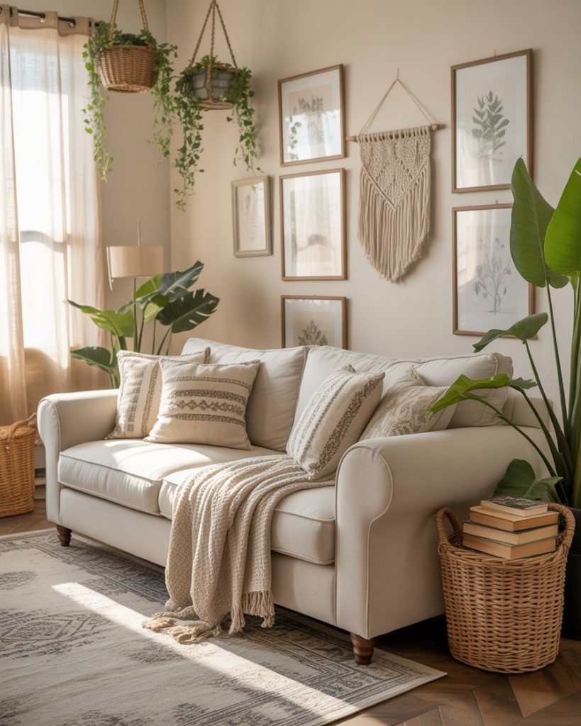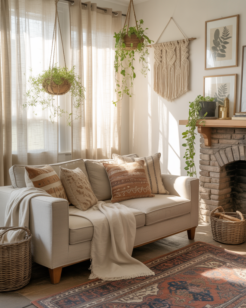 The boho farmhouse thrives on personality and layers. You’ll often find woven baskets, greenery, and colorful wall decor paired with rustic woods. A friend’s space sticks in my mind: her trailing plants softened every corner and made the rustic furniture feel alive. This style is less about rules and more about expressing individuality, creating a home that feels collected over time rather than purchased in one sweep.