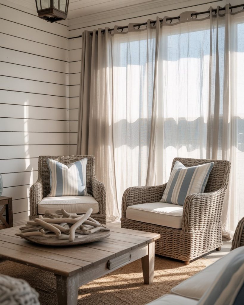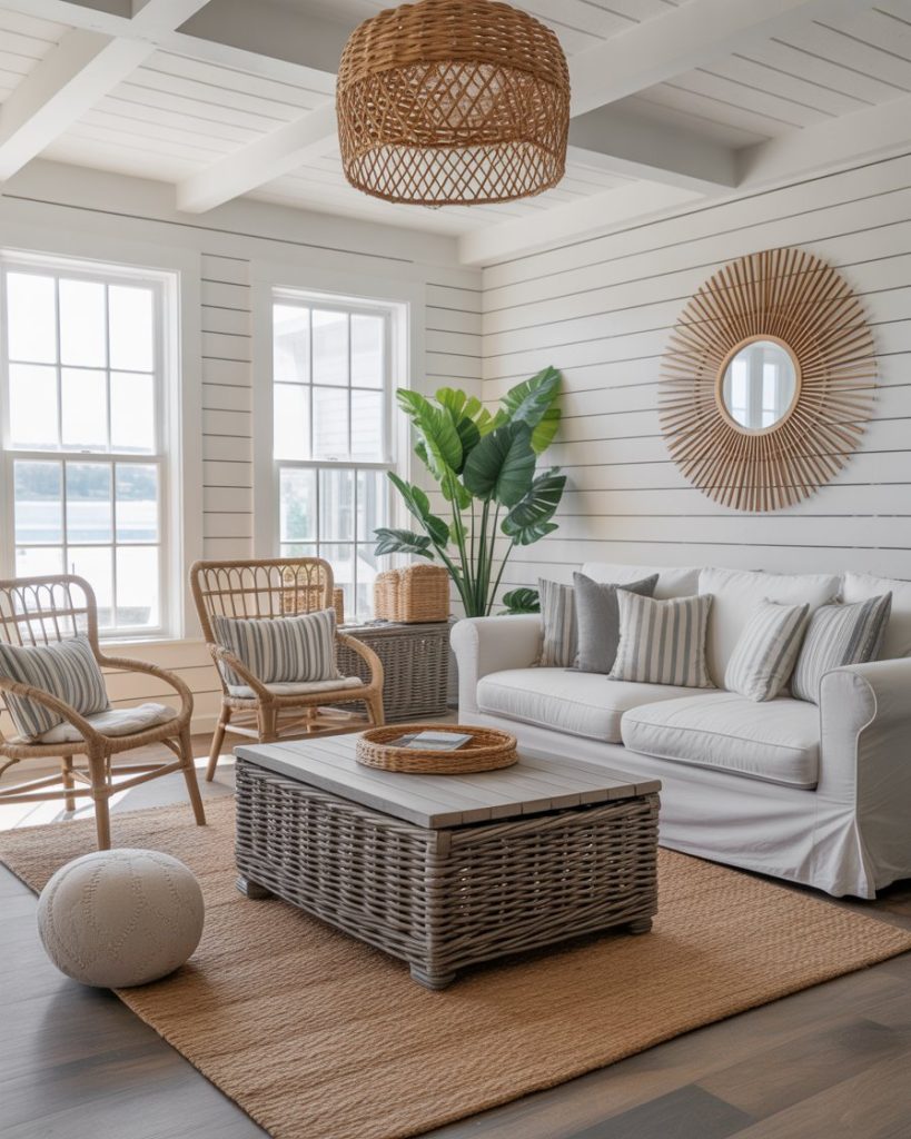 For a light and airy look, the coastal farmhouse is perfect. It blends black and white shiplap with sandy tones, rattan chairs, and ocean-inspired paint colors. Designers like Shea McGee often stress how natural textures bring calmness, and this style proves it. It reminds me of visiting a beach house where the living room felt open and fresh, almost like stepping into a breeze every time you walked in.