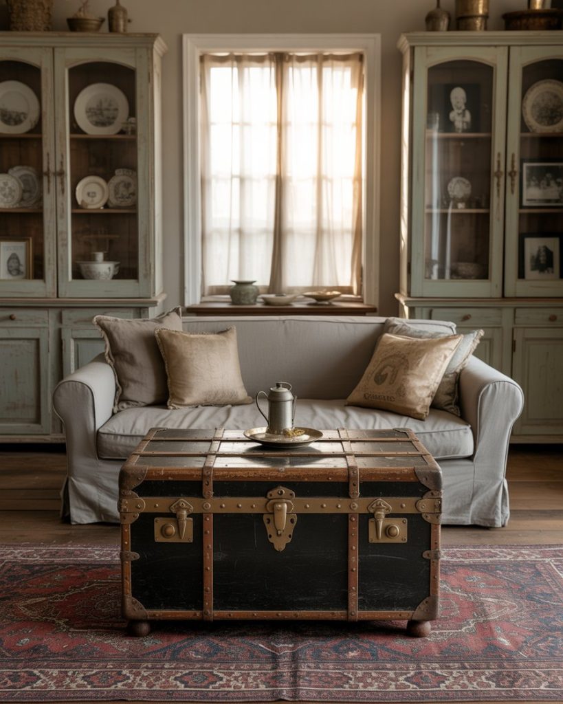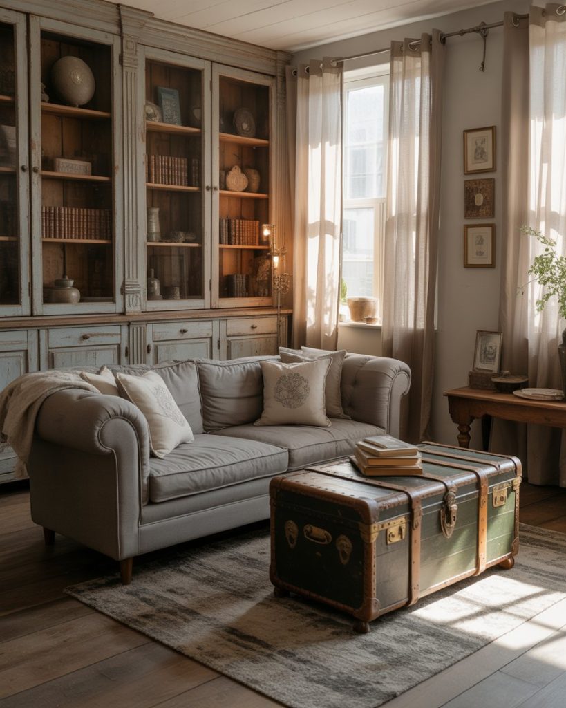 The vintage farmhouse celebrates well-loved pieces with soul. An antique trunk as a coffee table or a grey sofa with distressed cabinets makes the space feel authentic. A neighbor once proudly showed me her flea market lamp that stole the show in her living room—it had scratches and dents, but that was the charm. Vintage design is about finding beauty in imperfection, and that’s what makes it unique.