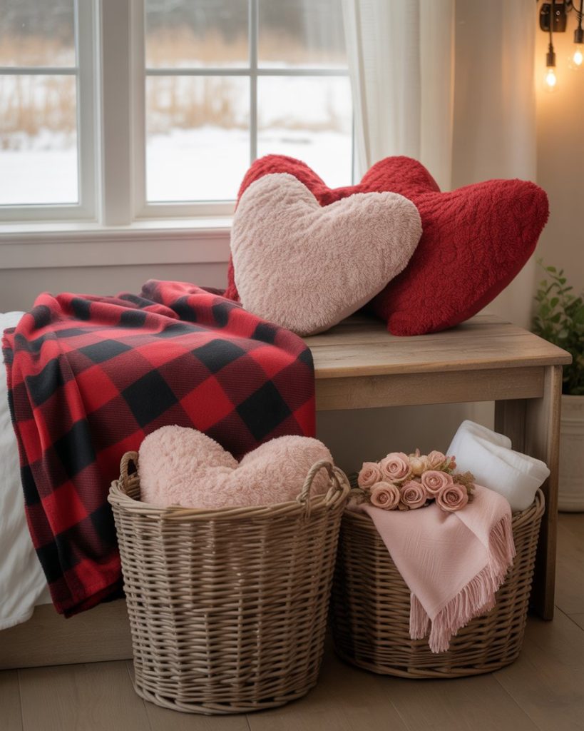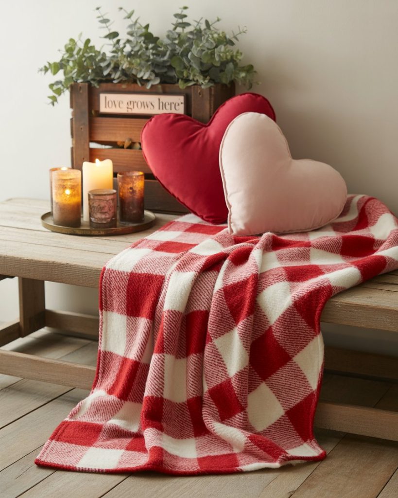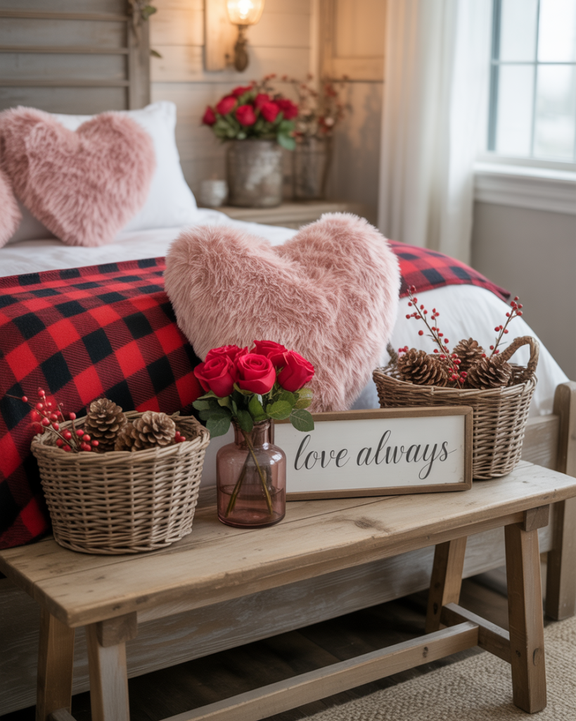 At the end of a bed, a farmhouse bench can be styled for Valentine’s Day. Add plaid throws, heart-shaped pillows, or a small basket with flowers. I once styled mine this way and it felt like walking into a boutique hotel. This is an easy way to extend Valentine’s charm into master bedrooms while keeping things cozy and neutral.