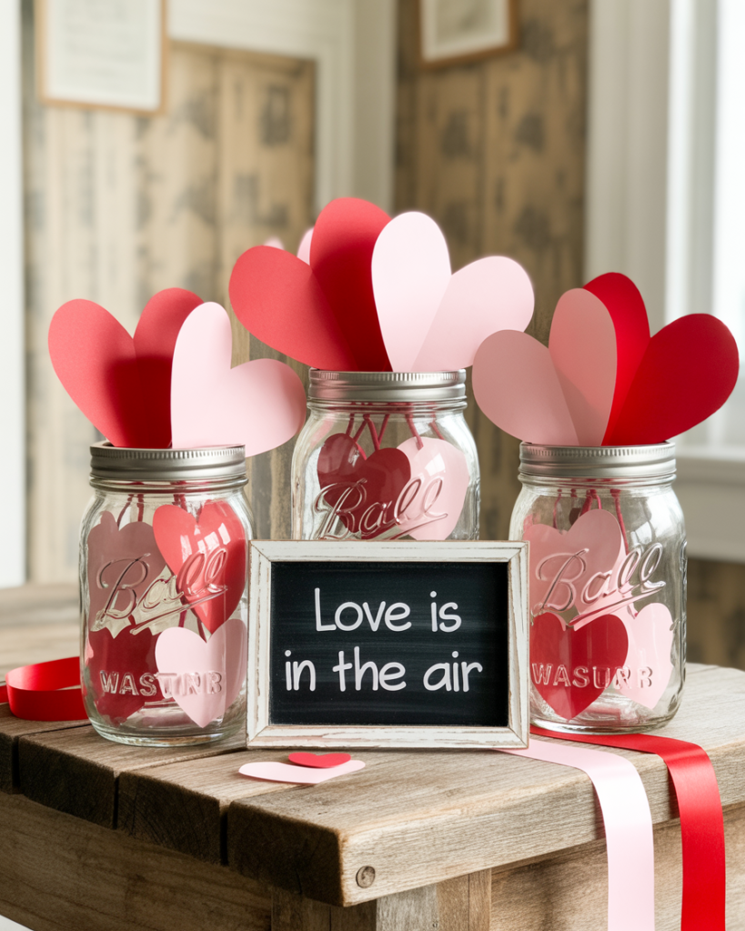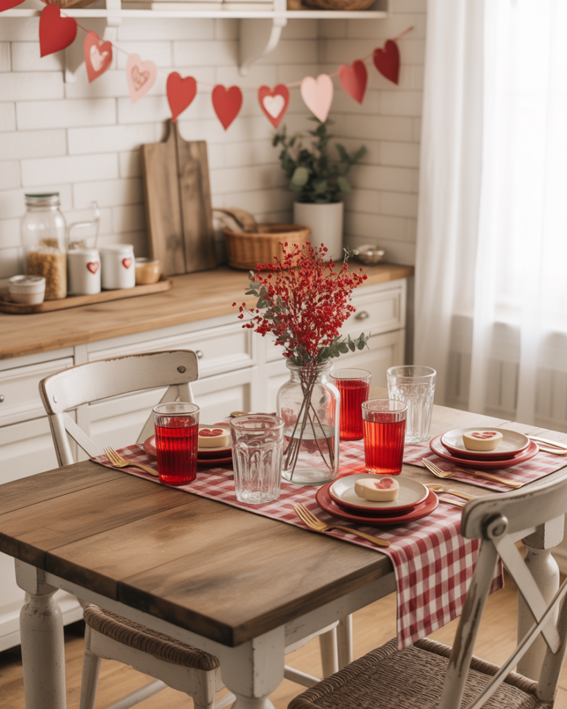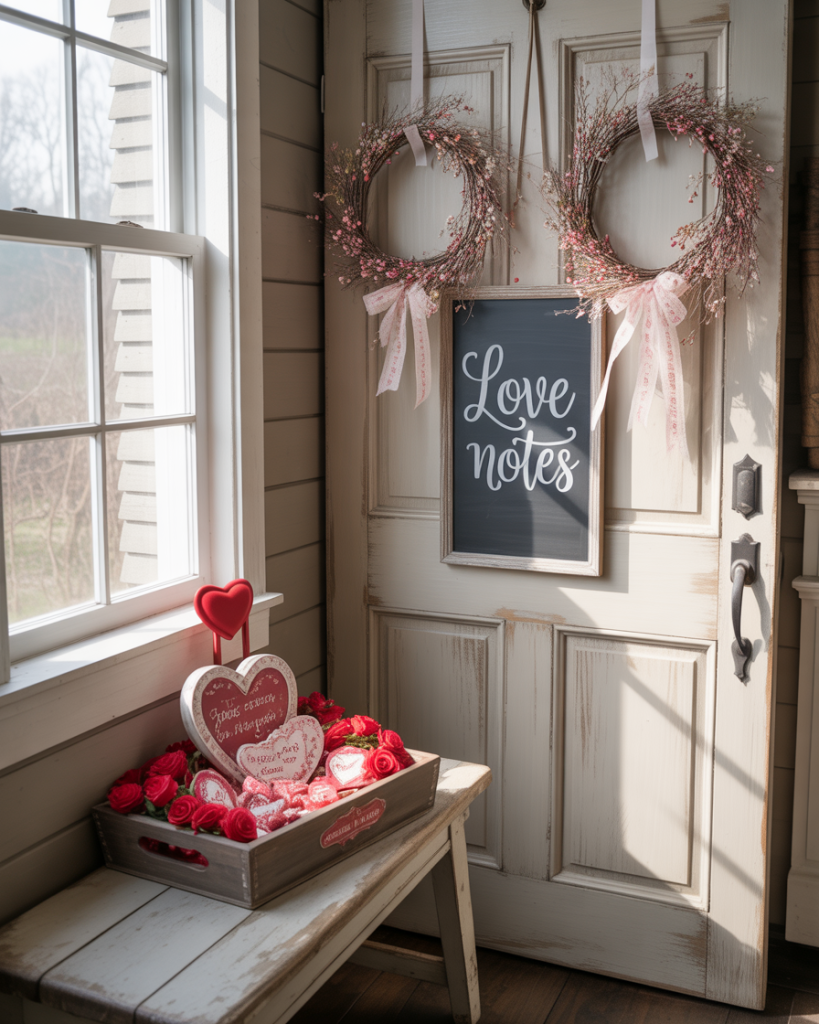 The entryway sets the mood as soon as you step inside. Add a chalkboard for handwritten love notes, a decorative tray for keys with heart accents, and a small wreath garland hung on a hook. I once visited a friend whose farmhouse entry displayed family Valentine’s notes—it felt so personal and welcoming. This DIY setup is inexpensive yet impactful, especially for families with kids.