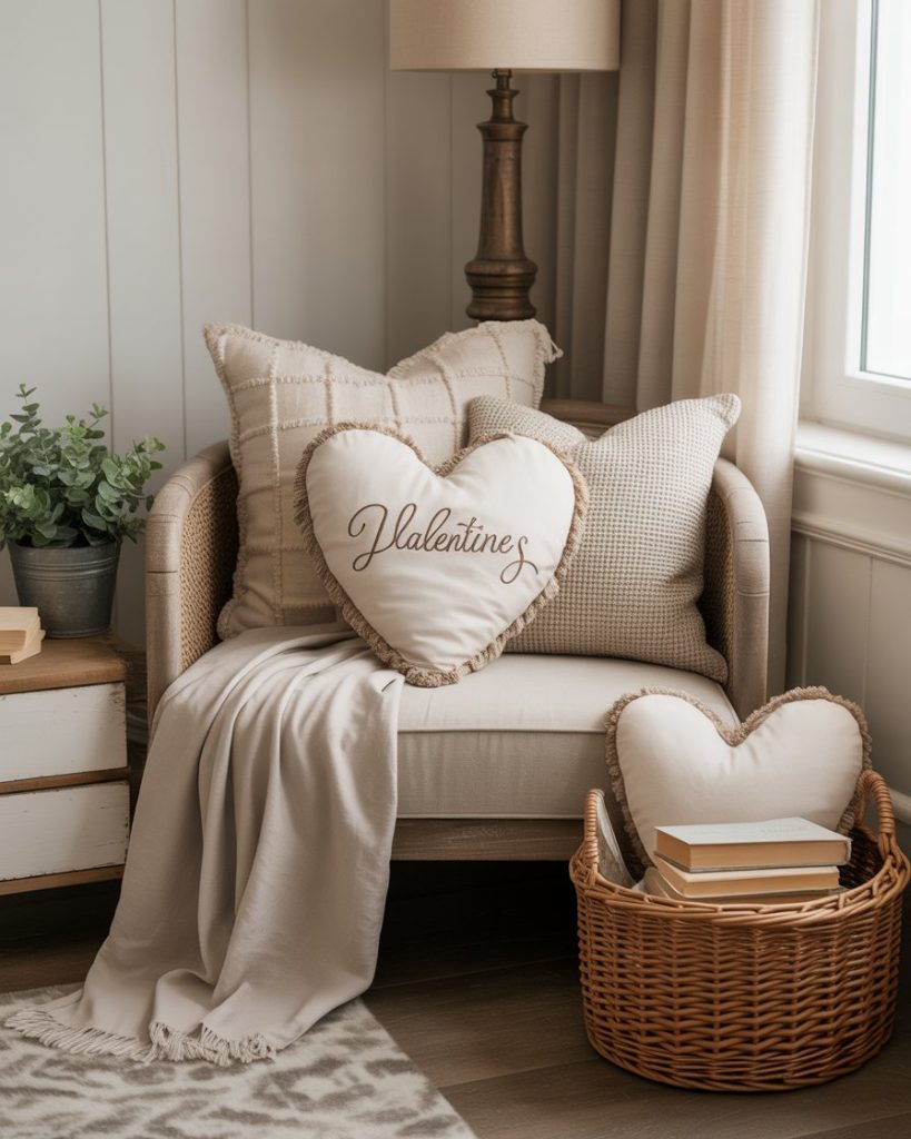 Transform a corner into a Valentine’s reading nook with cozy throws, neutral-toned pillows, and a basket of books. Adding a heart-shaped pillow or Dollar Tree crafts like a painted sign makes it festive without being overdone. I once turned my unused corner chair into a Valentine’s nook, and it became my favorite spot for tea. These ideas add comfort while staying true to rustic farmhouse style.
