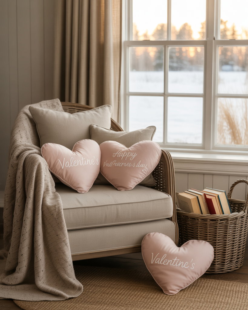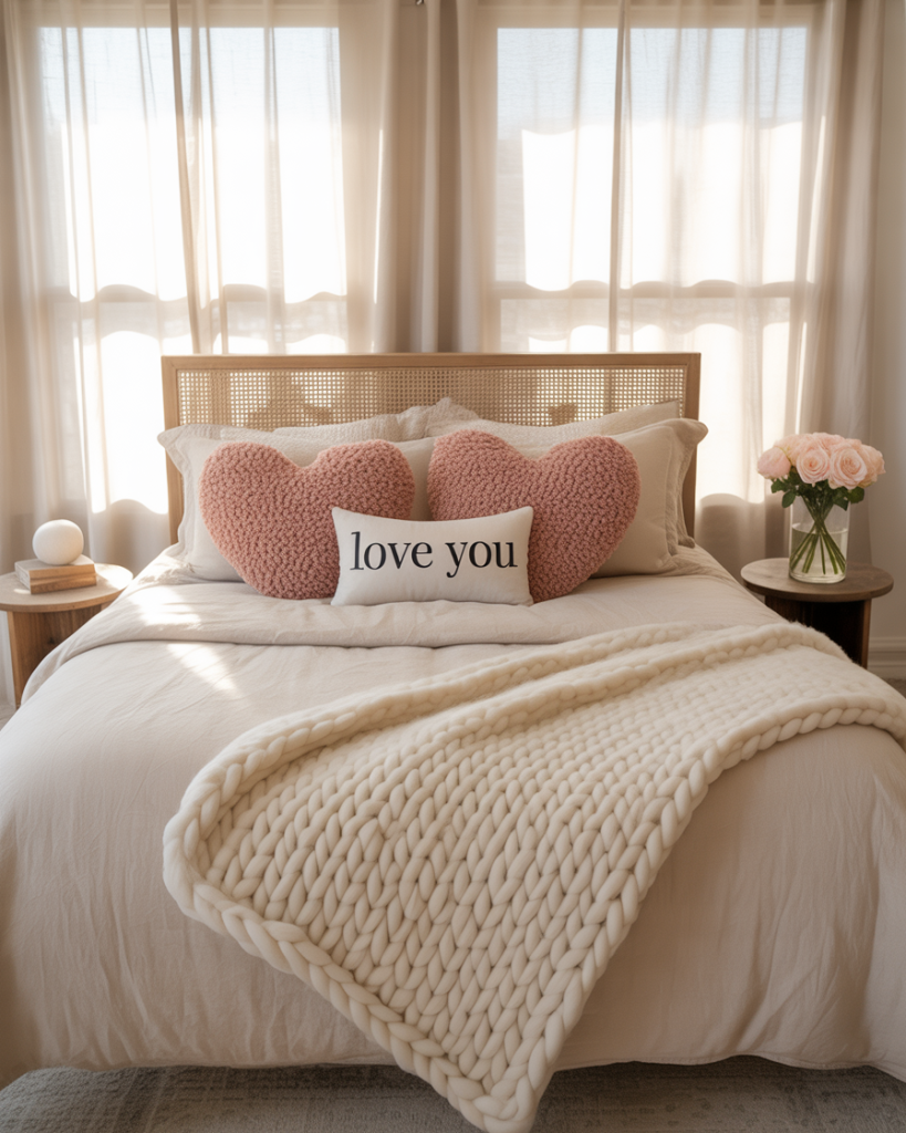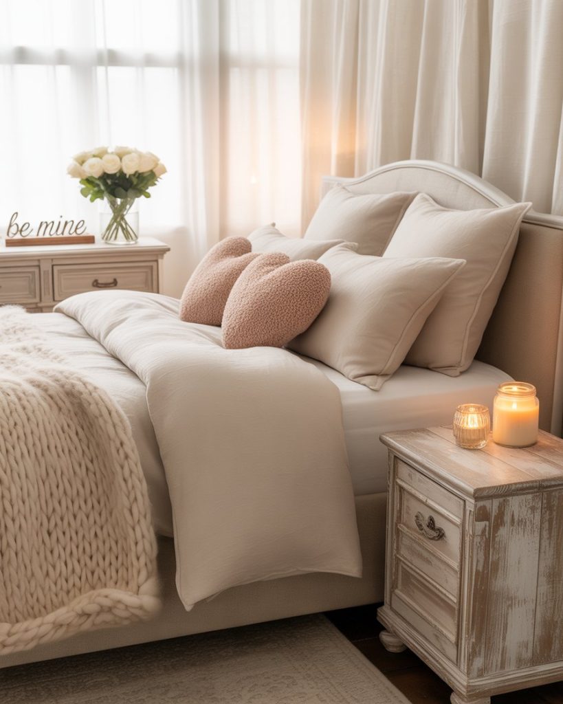 For couples who prefer a calm vibe, neutral Valentine’s décor in master bedrooms creates the perfect retreat. Creamy linens, wooden accents, and textured throw pillows in heart shapes bring romance without overwhelming the space. Neutral tones are versatile—you can keep them well past Valentine’s Day. Designers like Liz Marie Galvan often highlight neutrals as timeless ideas for farmhouse living. I tried this in my own bedroom last year, and it felt like a cozy hotel getaway without leaving home.