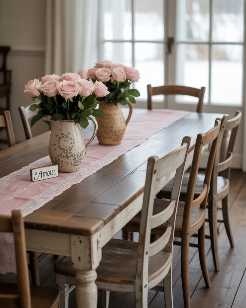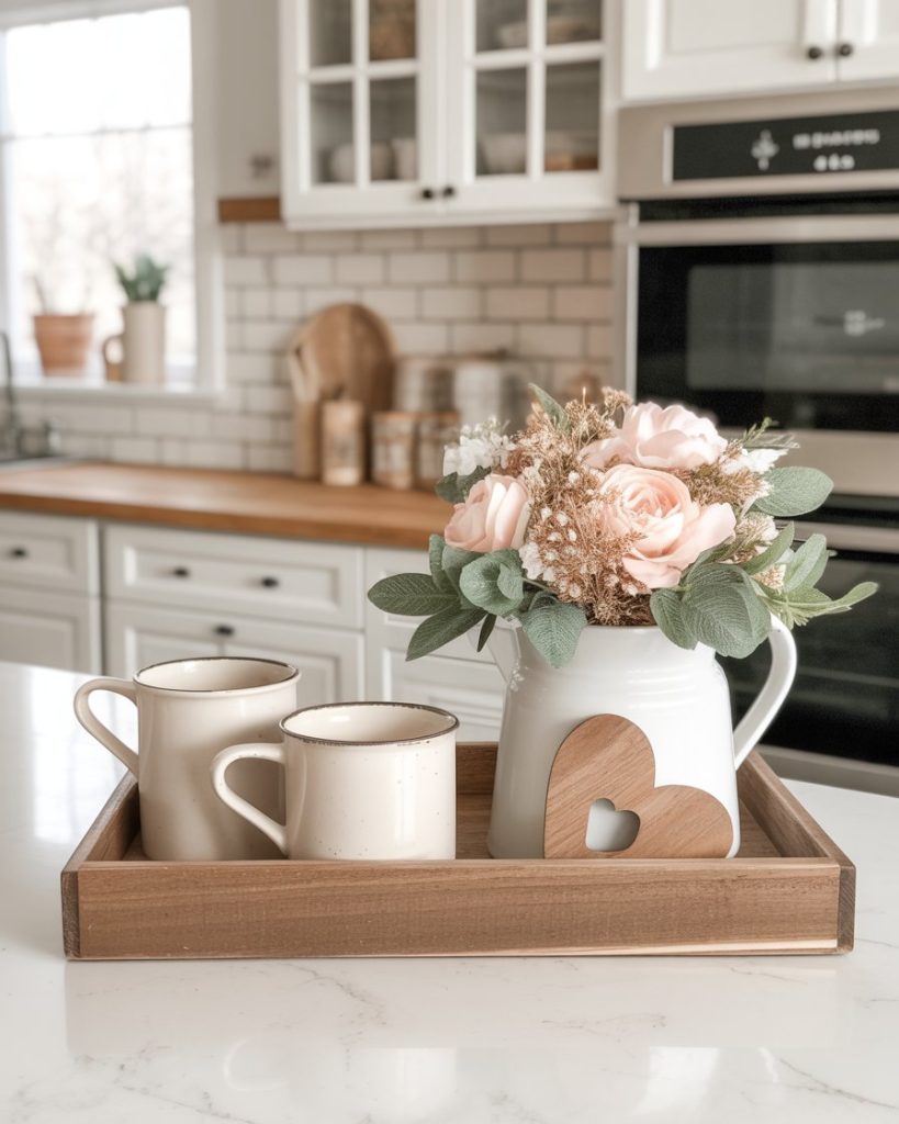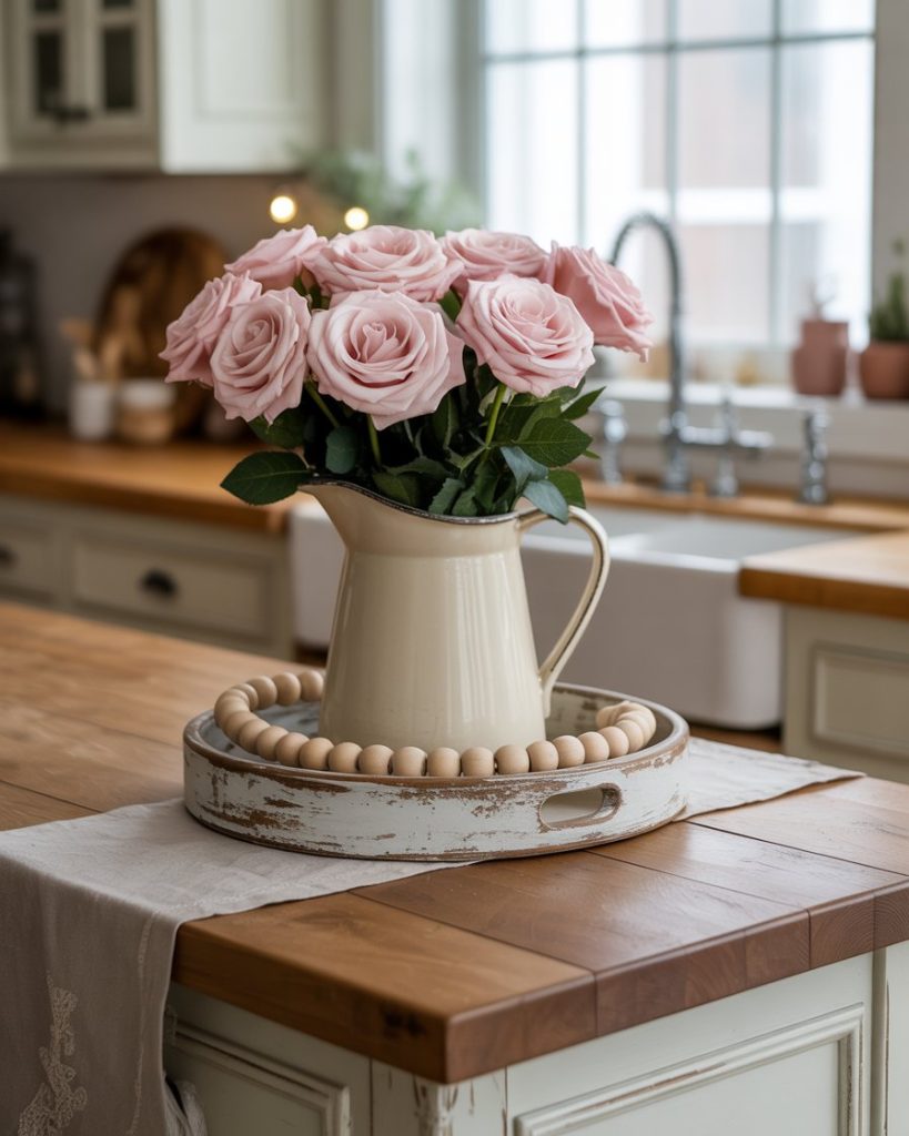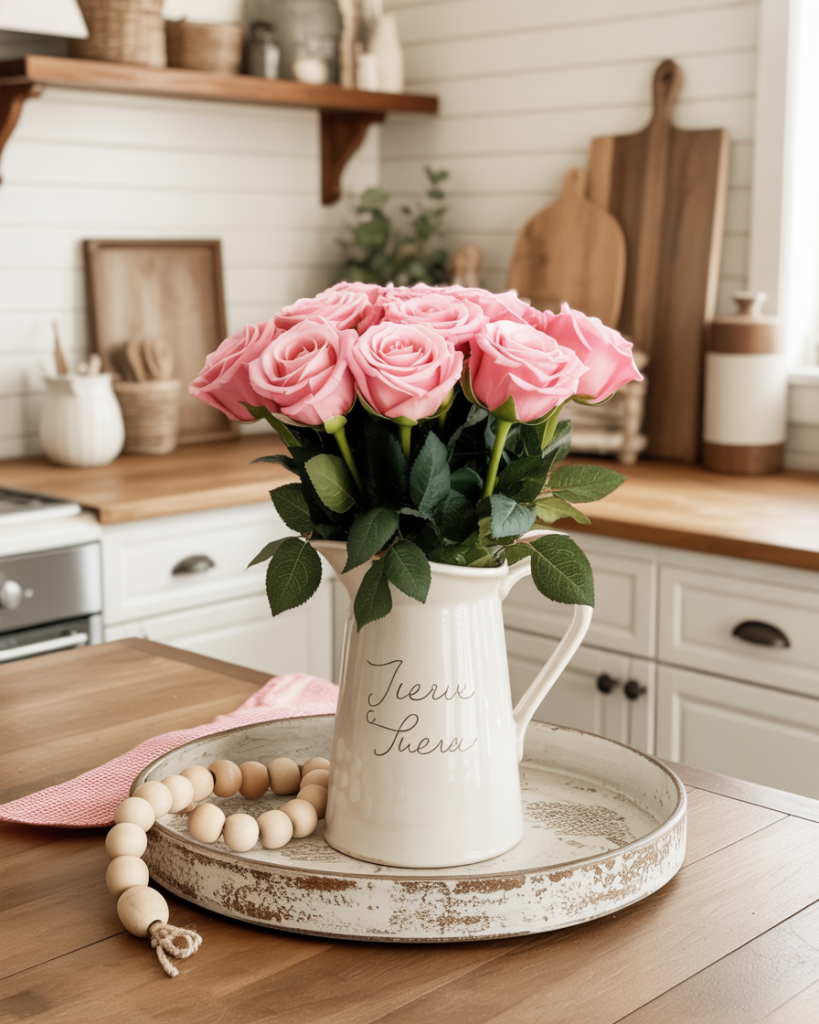 Your kitchen island is a natural gathering place. A French country-inspired Valentine’s centerpiece with roses in a ceramic pitcher, wooden beads, and a rustic tray can completely change the vibe. I once styled mine this way for guests, and everyone gravitated toward the island first. It proves that farmhouse ideas don’t have to be complicated to make a statement.
