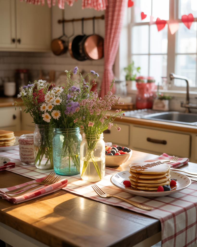Start the day with a themed breakfast table. Use plaid napkins, small wreaths garlands around candles, and DIY crafts like painted jars for utensils. I tried this once for my kids, and their faces lit up when they saw heart pancakes on a festive table. Simple touches transform ordinary mornings into holiday memories while keeping the look farmhouse cozy.