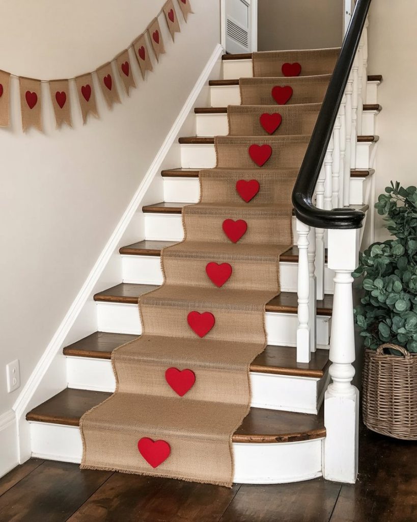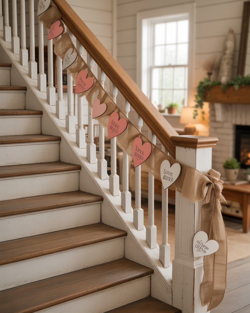 A staircase can be a surprising spot for farmhouse Valentine’s charm. Drape burlap wreaths garlands with wooden hearts along the banister. I once decorated mine this way, and it made even the walk upstairs feel festive. Designers often suggest treating staircases as display areas, and this rustic DIY idea works especially well in homes with open layouts.