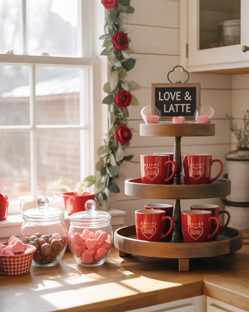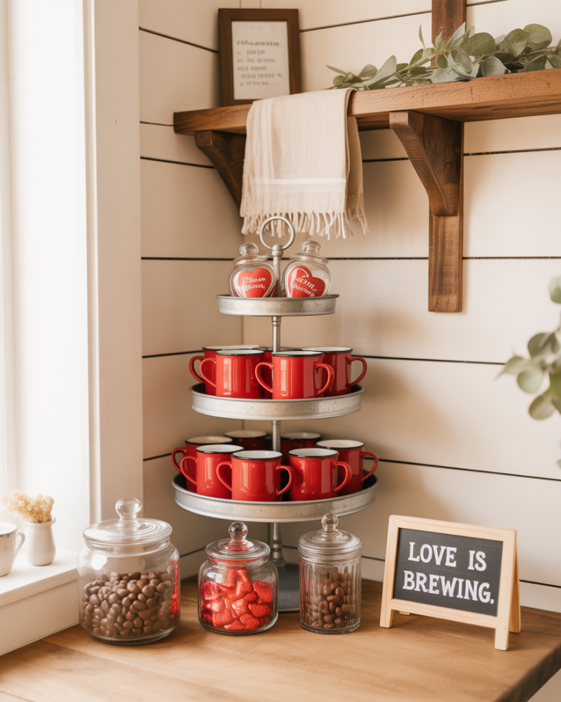 Coffee lovers can style a Valentine’s coffee bar. Use tiered decorative trays, red mugs, chalkboard labels, and candy jars. I remember when my sister set one up—her guests loved making their own festive drinks. It’s both practical and pretty, showing how farmhouse kitchen ideas can blend function with romance.