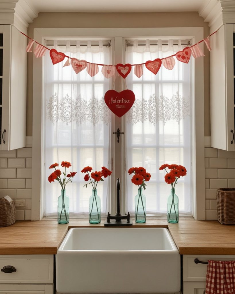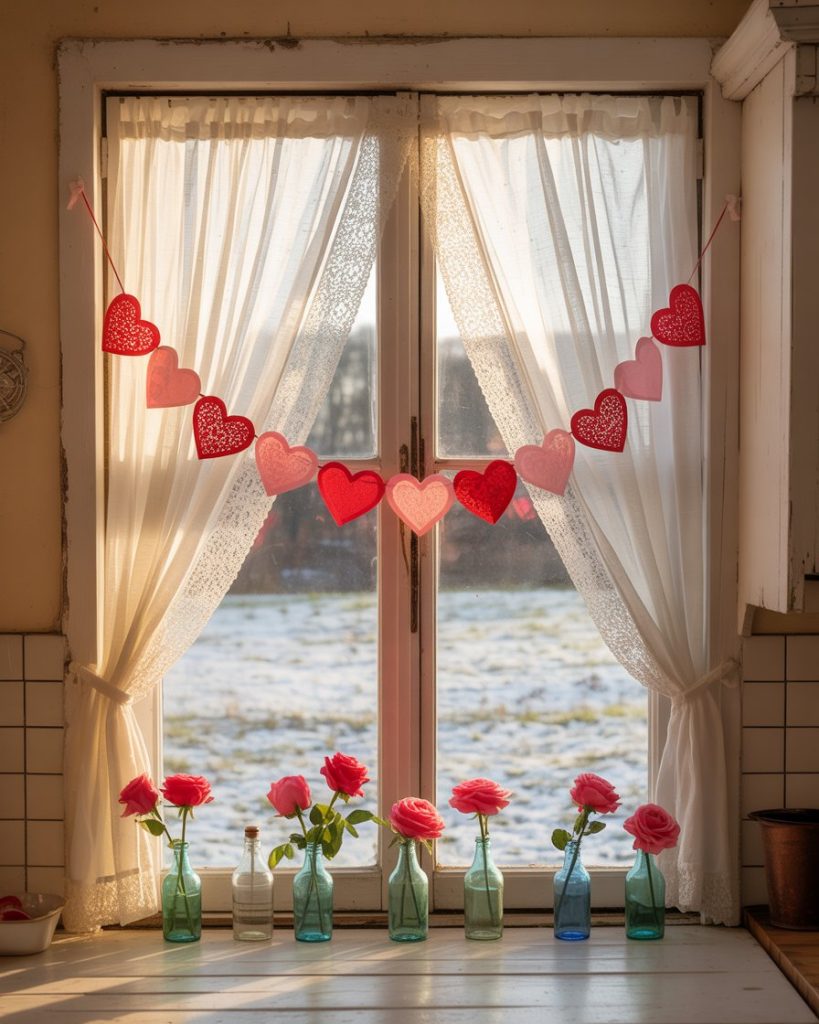 Windows are often overlooked but can shine with neutral Valentine’s accents. Drape simple lace curtains, hang heart-shaped garlands, or add small Dollar Tree crafts to the sill. One year, I placed vintage bottles with red blooms in my kitchen window, and it became my favorite view while cooking. These ideas are both easy and charming.