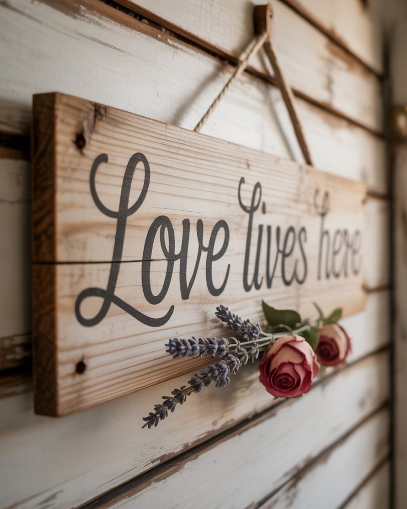 Country wall signs with Valentine’s sayings like “Love Lives Here” or “Be Mine” can bring farmhouse character into any room. Whether bought at Walmart or made as DIY crafts, they add personality. A friend of mine used reclaimed wood for hers, and it instantly became the conversation piece in her living room. These signs mix farmhouse humor with holiday charm.