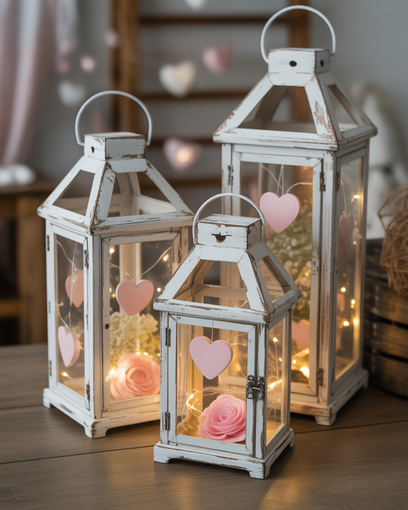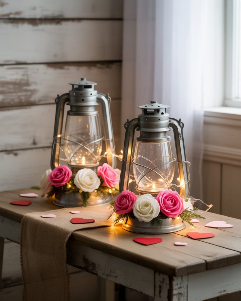Lanterns are farmhouse staples, and styling them for Valentine’s is easy. Fill them with fairy lights, faux flowers, or small heart ornaments. I once found lanterns at Target and styled them with candles and red beads—they looked high-end without the price. These ideas work indoors or outdoors, giving you versatile farmhouse charm.