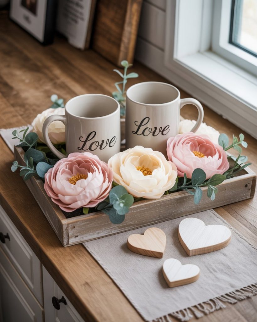 In the kitchen, styling decorative trays can instantly add festive charm. Fill them with red mugs, faux florals, or wooden heart cutouts for simple DIY crafts that feel polished. The beauty of trays is how quickly they can be swapped—after Valentine’s Day, you can easily change them out for spring. I personally love how one styled tray by the coffee maker makes mornings feel like a special ritual. Small ideas like these go a long way.