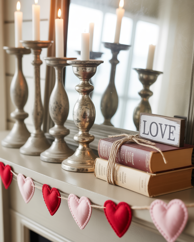 The fireplace mantle is the perfect spot for a cozy Valentine’s display. A mix of distressed candlesticks, twine-wrapped books, and garlands of wooden hearts creates a vintage country look. I once styled mine using items from flea markets, and it felt both personal and timeless. Experts at The Inspired Room often say mantles serve as anchors for seasonal décor, which makes them a great place to experiment with farmhouse-inspired Valentine’s touches.
