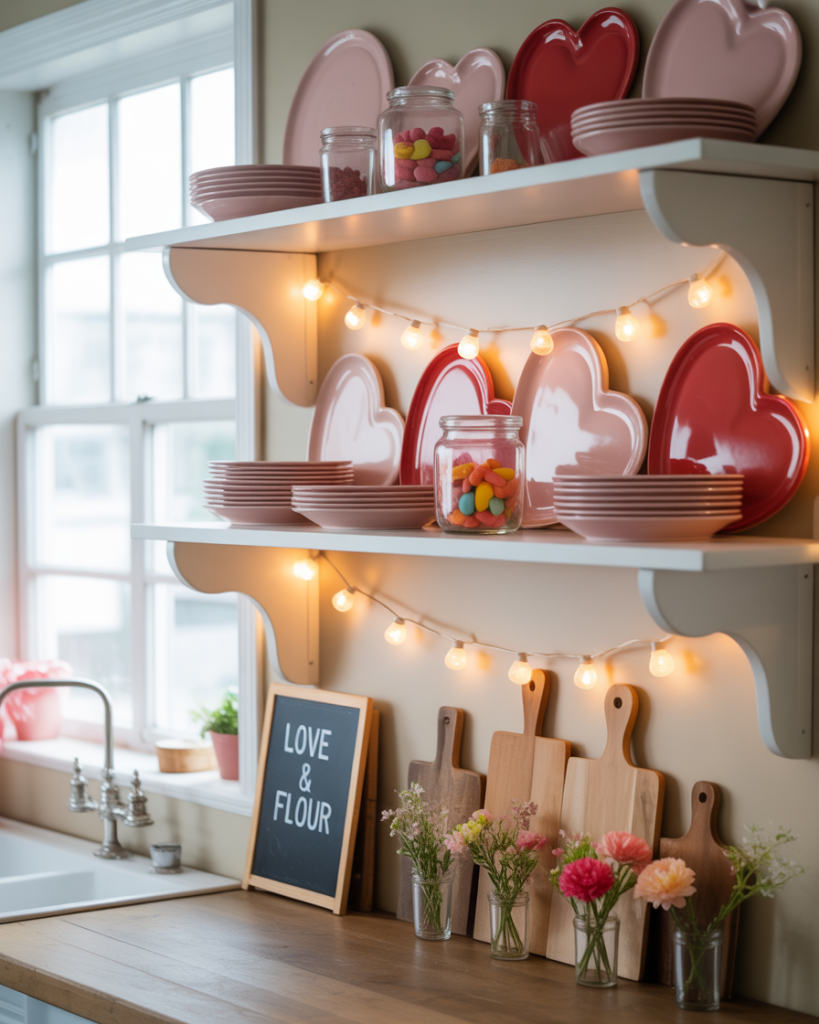 Open shelving in the kitchen makes a great stage for Valentine’s décor. Add heart-shaped plates, glass jars filled with candies, and layered cutting boards for farmhouse charm. I’ve found that simply switching shelf décor for each season makes my whole kitchen feel refreshed, even if I haven’t changed anything else. Designers often call shelves “mini mantles,” which makes them perfect for small ideas that pack a big punch.