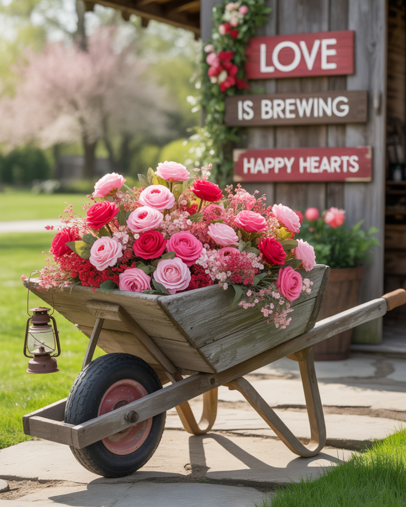 Why stop indoors? Country-inspired outdoor Valentine’s décor brings the holiday to life for neighbors and passersby. Wooden signs, lanterns, and even an old wheelbarrow filled with faux florals make charming displays. I once drove past a barn decorated with hearts in Ohio, and it was pure Hallmark magic. Simple outdoor ideas like this extend the celebration and spread cheer to your whole street.