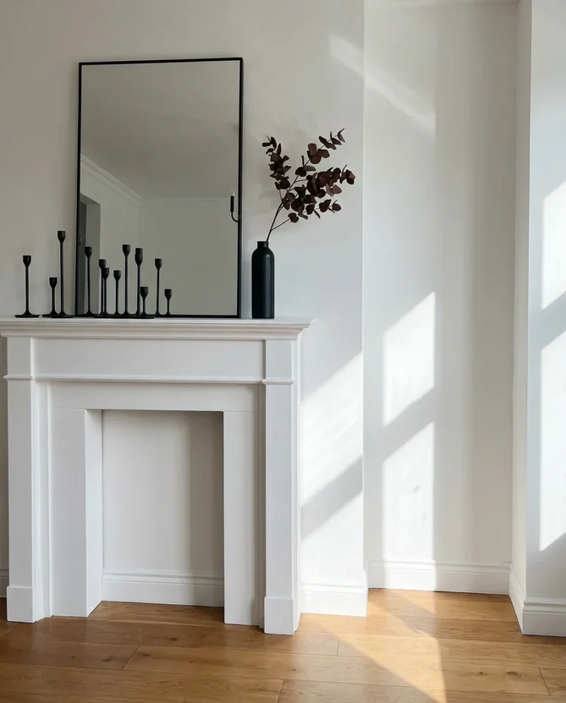 Combining a white fireplace surround with black accessories and art creates a graphic, high-contrast look that feels both timeless and very 2026. The approach: a crisp white painted mantel, a black-framed oversized mirror or piece of art leaning against the wall, matte black candleholders, and a deep charcoal or black fireback visible through a clean glass spark screen. The contrast is intentional and architectural—it works in both traditional and contemporary settings because it relies on tonal relationships rather than style-specific details.