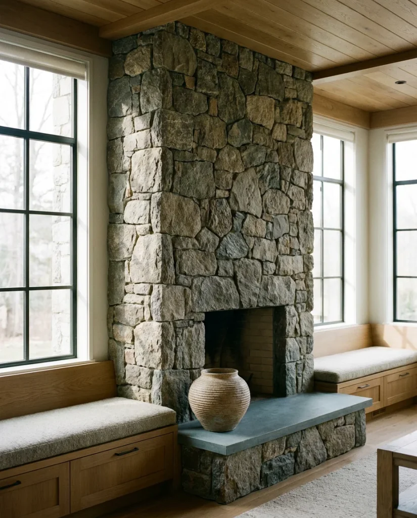 Where this works best: open-plan homes with high ceilings, mountain cabins, or any space where the architecture already has bones. A stone fireplace in a small urban apartment can feel overwhelming unless the rest of the room is kept deliberately spare. The stone should be the loudest thing in the room—let everything around it stay quiet and supportive. Resist the urge to add too many contrasting colors; let the natural variation in the stone do its own visual work.