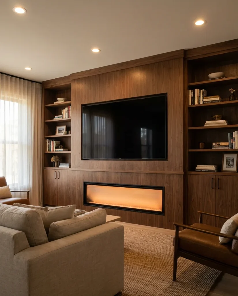The ideas with the TV category—how to successfully combine a television and a fireplace in the same wall composition—have generated some of the most creative living room solutions in recent memory. In 2026, the trend is toward full wall integration: the TV sits within a custom millwork frame that also houses the fireplace insert, flanking shelves, and hidden media storage. The result is a single, unified wall that looks like it was designed rather than assembled. This approach works particularly well in living room spaces where the fireplace and TV are already on the same wall.