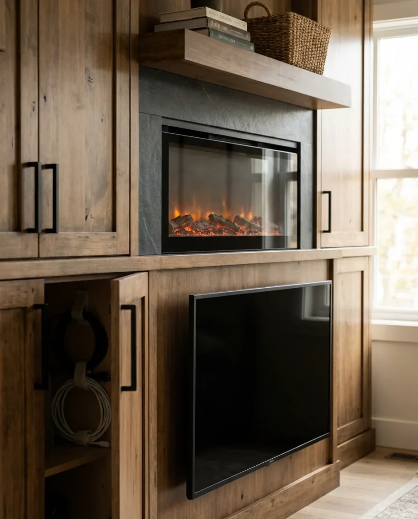 One practical tip most designers will tell you: the TV should sit no higher than eye level when you’re seated. When a TV is mounted directly above a fireplace, it often ends up too high, straining the neck over hours of watching. If repositioning isn’t possible, consider a tilting mount that angles the screen slightly downward. Frame the whole setup with built-in shelving on either side to give the wall a cohesive, intentional look that makes both the TV and the fireplace feel like they belong together.