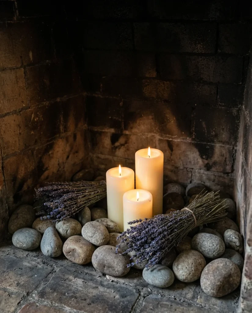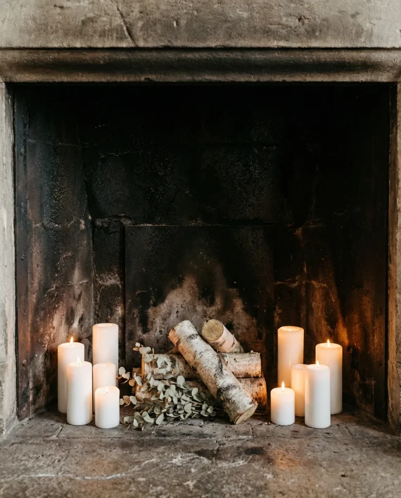 Styling the inside of the firebox itself—rather than just the mantel above it—is a design move that’s gaining serious traction in 2026. For unused or seasonal fireplaces, the opening becomes a deep, shadowy niche that benefits enormously from deliberate arrangement. Tall white pillar candles of varying heights, surrounded by a loose arrangement of birch logs and dried eucalyptus, create a scene that feels both natural and intentional. The depth of the firebox adds drama that a flat surface simply can’t replicate.