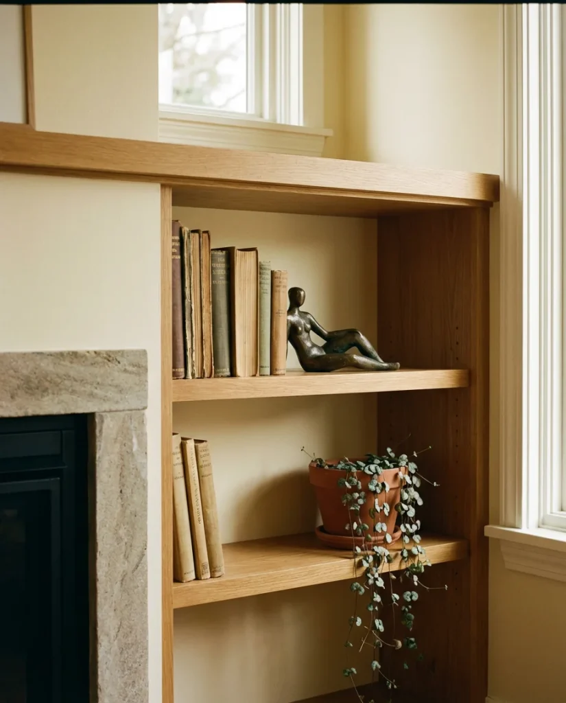 The most common mistake with fireplace built-ins is treating them as pure book storage and filling every shelf tightly with spines. The rooms that photograph best—and feel best in person—mix books with objects, plants, and intentional empty space. A good ratio: roughly 60% books or functional items and 40% decorative objects and breathing room. Paint the interior back of the shelves in a contrasting tone—navy, forest green, or warm clay—to add depth and make each shelf feel like its own little tableau.
