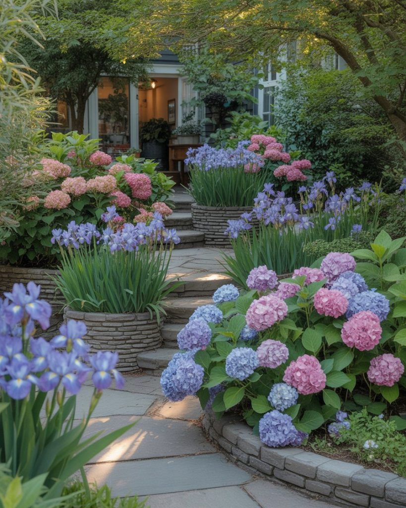 Your home’s first impression starts in front of house. Framing pathways with seasonal flowers like Iris or hydrangeas adds curb appeal and warmth. Consider using tiered planters or climbing vines to enhance your aesthetic. This design invites guests with charm and shows how a little garden care can transform your entryway.